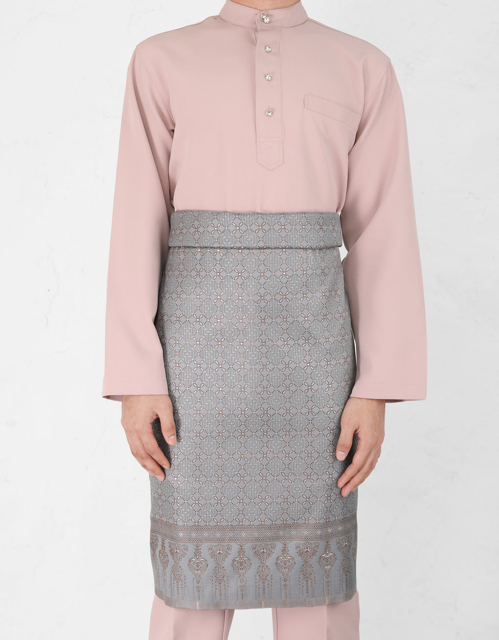 No matter the Baju Melayu style, Samping is the statement piece that completes the traditional attire. The most common style is the 'ikatan lingkup' where the sampin is first folded tightly across the chest, then rolled down to hold the cloth in place.