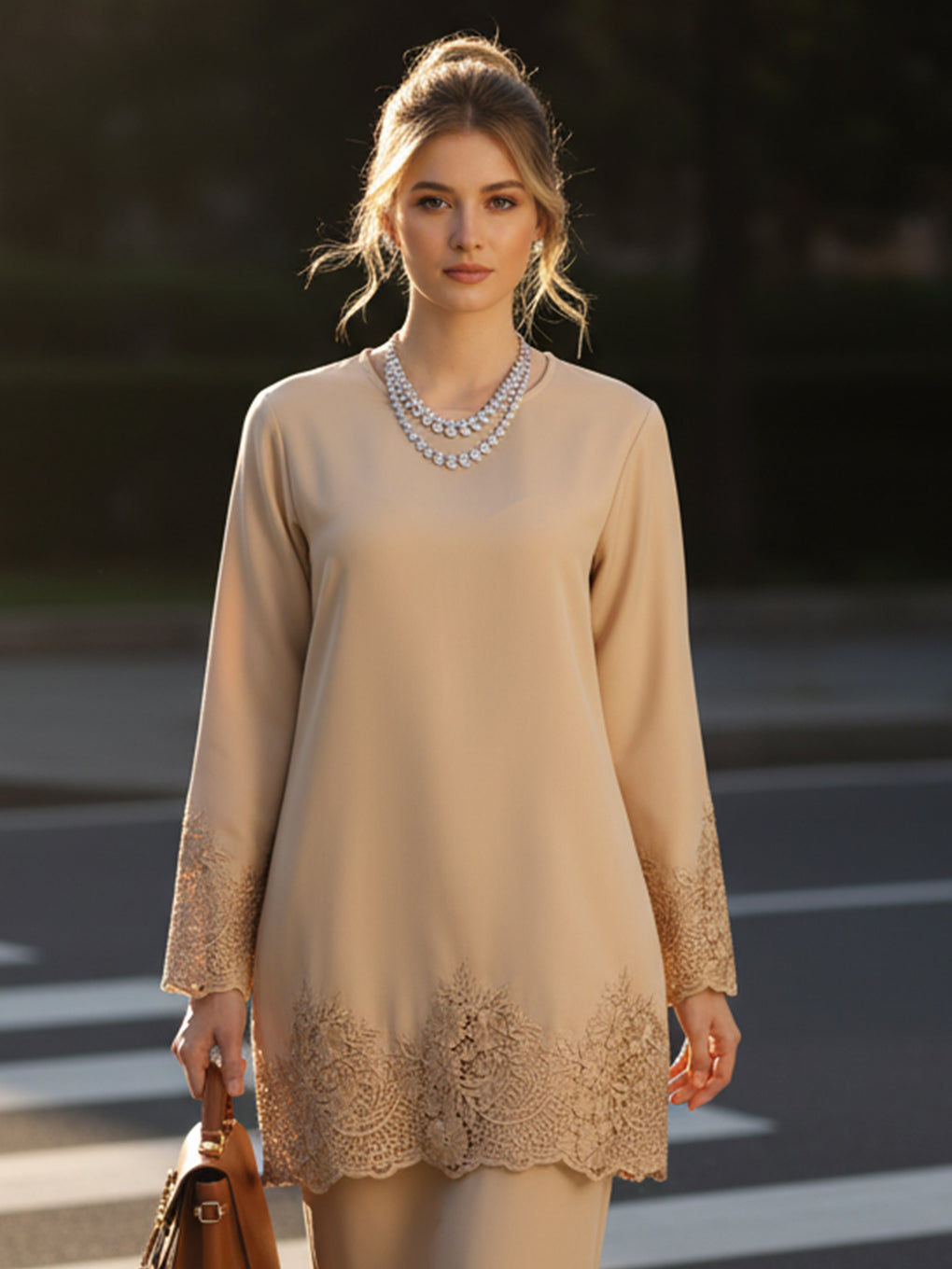 Material: Delta Crepe - A highly breathable and wrinkle resistance fabric for your daily convenience elevated with high-quality lace detailing on the cuff, adding a touch of elegance to your wardrobe.