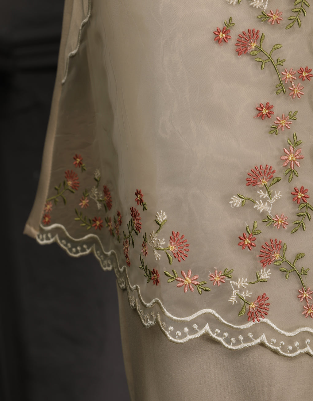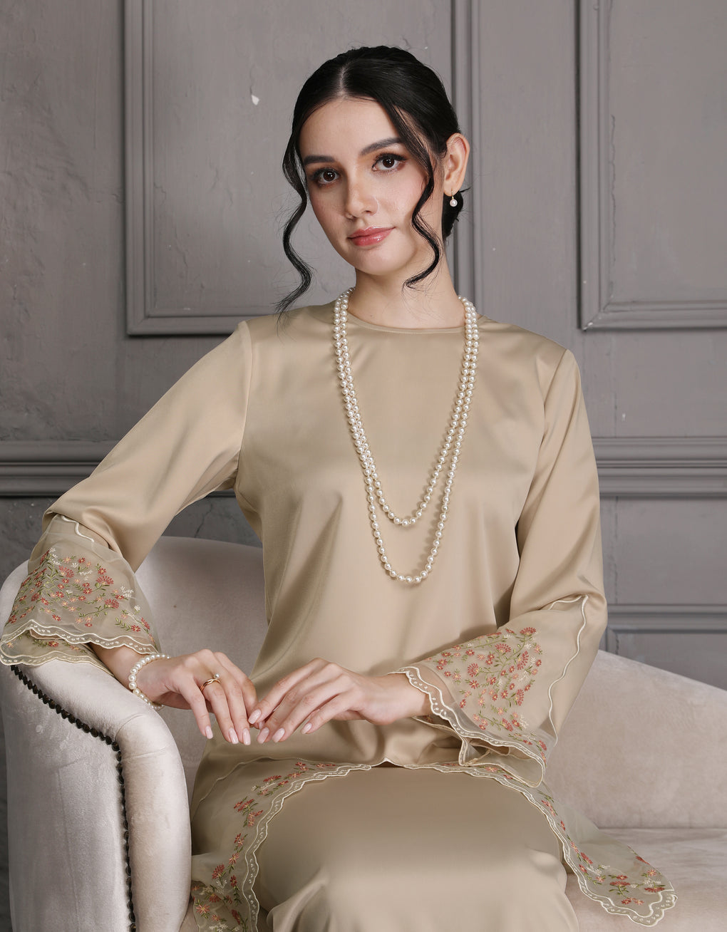 'Baju Kurung Pahang Moden Aurelia' blends tradition with a modern touch. Made from premium Italian Silky Satin, this piece features delicate embroidery on soft organdy that enhances its refined look. It offers both elegance and comfort in a long, flattering silhouette. A timeless choice for formal events or refined everyday wear.