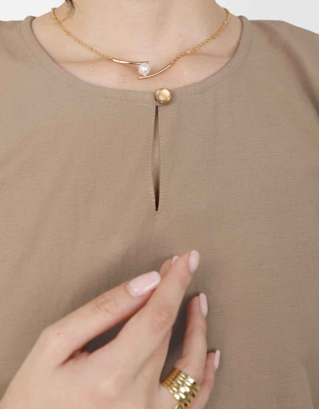 ✿ Notched round neck with pearl button