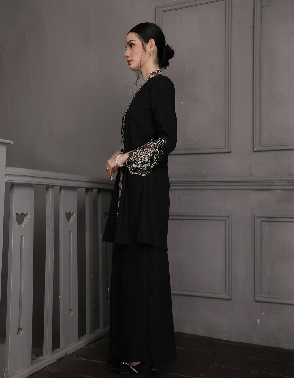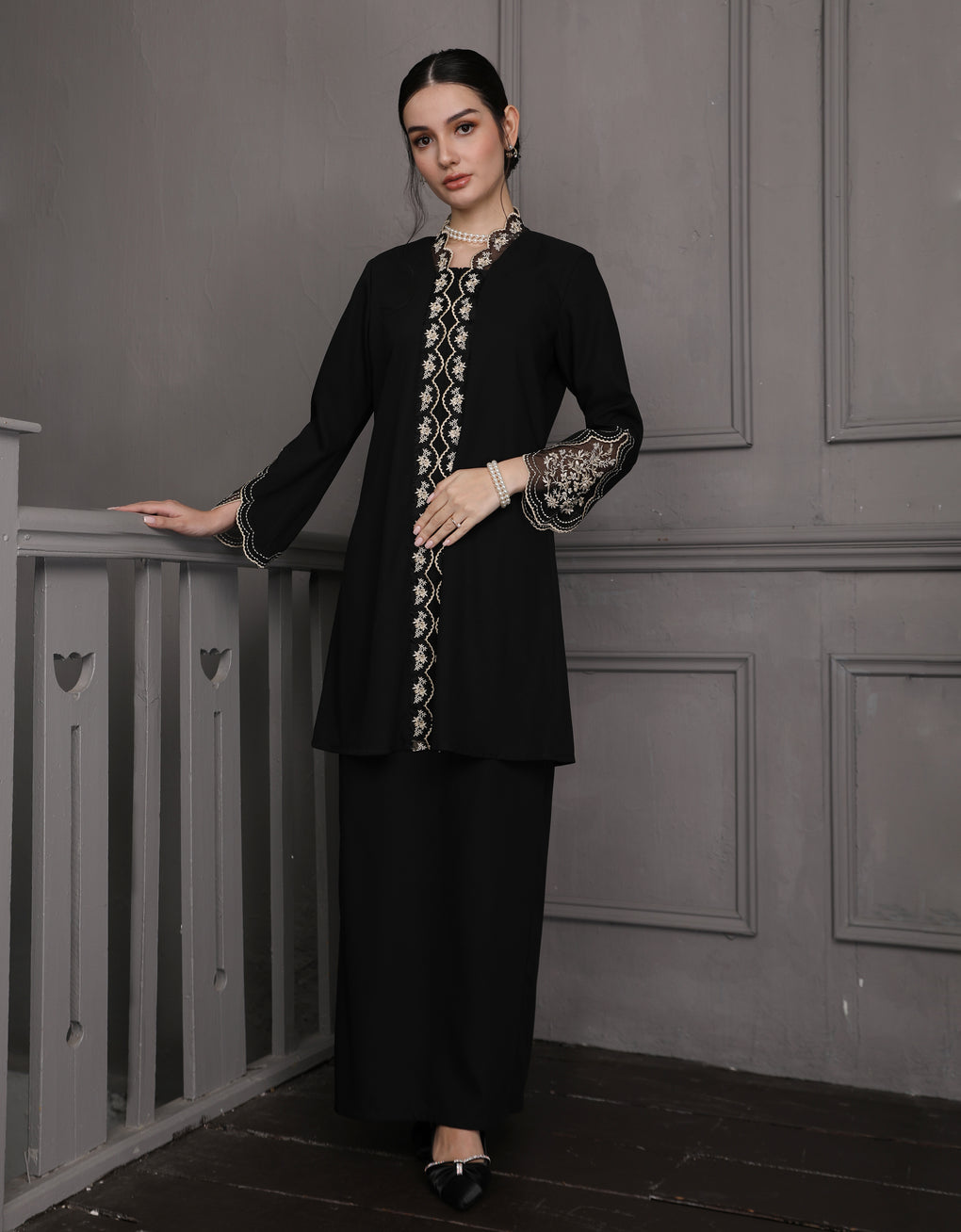 The 'Baju Kebaya Felisa' features luxurious Italian Silky Satin fabric, offering a smooth and elegant drape. Its scalloped neckline adds a refined touch, while the intricate Embroidered Organza detailing on the center and sleeves enhances its sophisticated appeal. This kebaya is an excellent choice for festive celebrations or formal events, combining traditional craftsmanship with contemporary elegance.