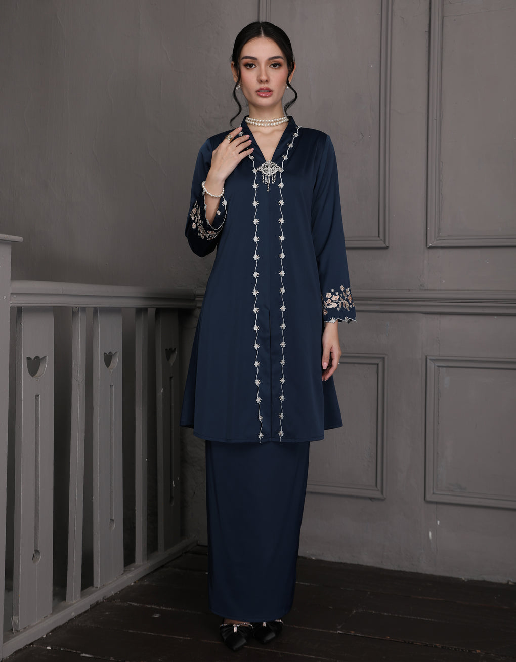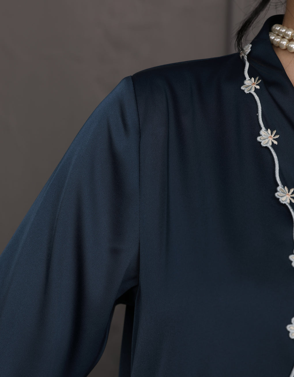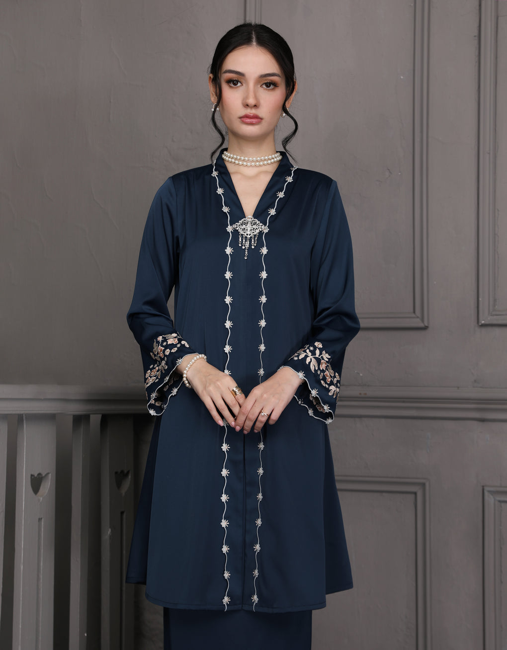 The 'Baju Kebaya Moden Winona' is crafted from Italian Silky Satin with a detailed Embroidered on the sleeves. Elegant and refined—perfect for festive or formal occasions.