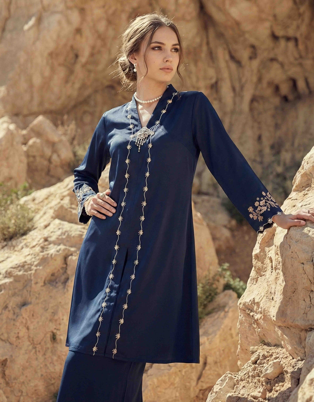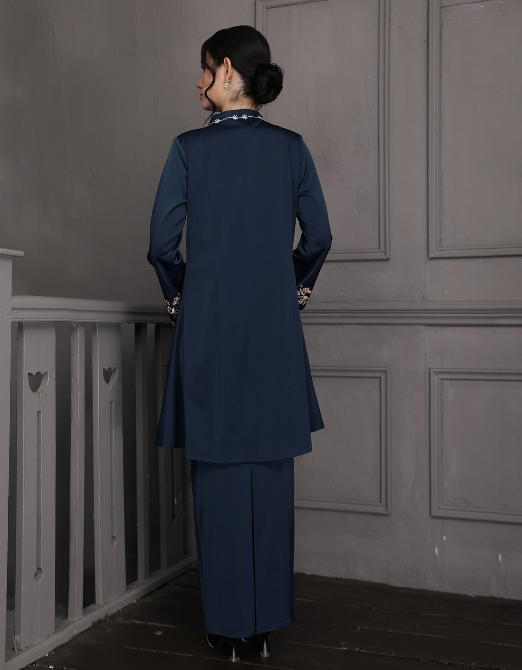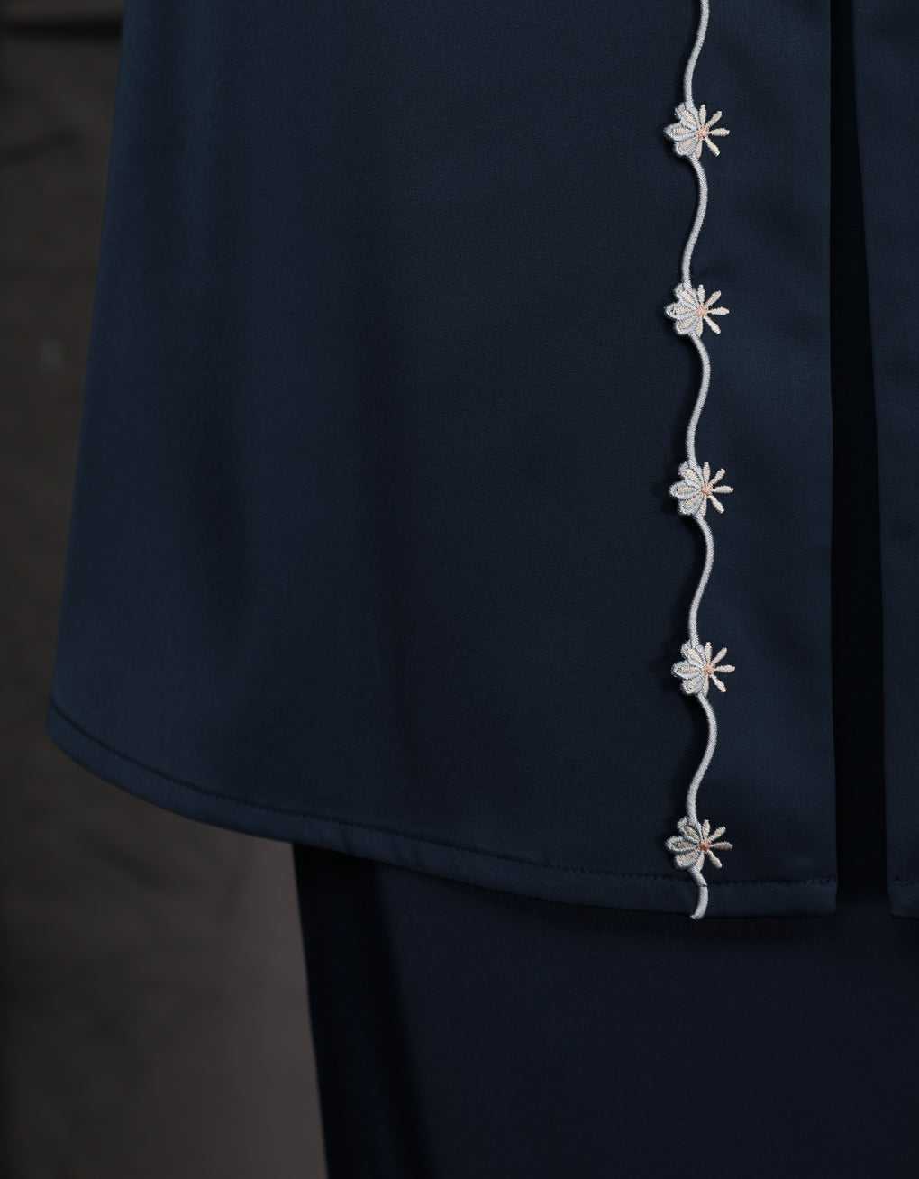 The 'Baju Kebaya Moden Winona' is crafted from Italian Silky Satin with a detailed Embroidered on the sleeves. Elegant and refined—perfect for festive or formal occasions.