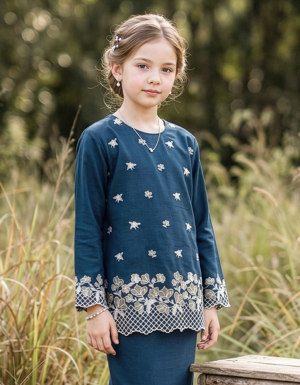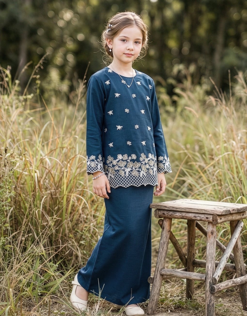 "Kids Baju Kurung Kedah Thalia" blends tradition with a modern touch. Made from premium linen cotton with beautiful multicolor embroidery, it offers comfort and elegance in a long, graceful cut. Perfect for formal events or stylish everyday wear, it’s a timeless piece for those who appreciate both heritage and contemporary style.