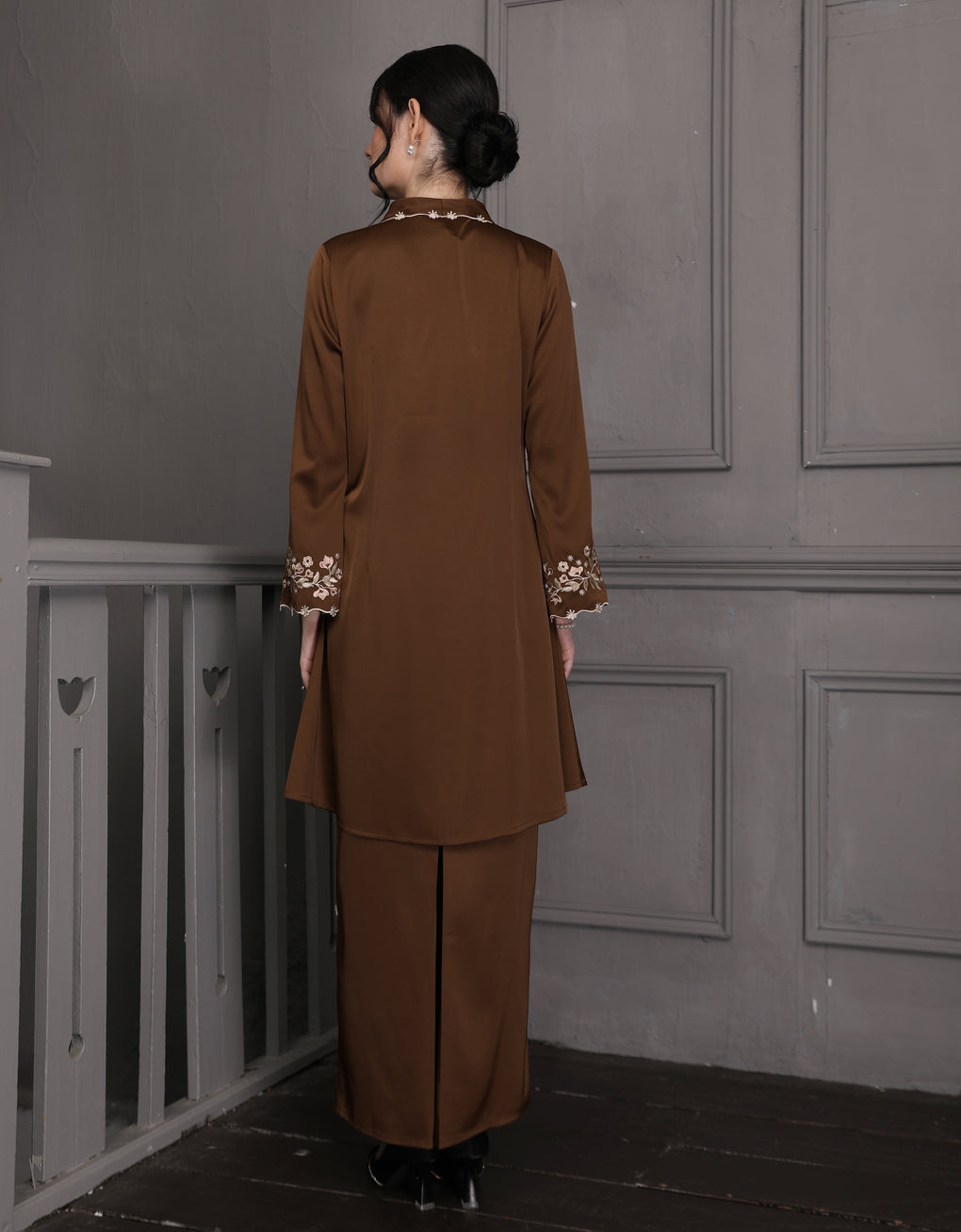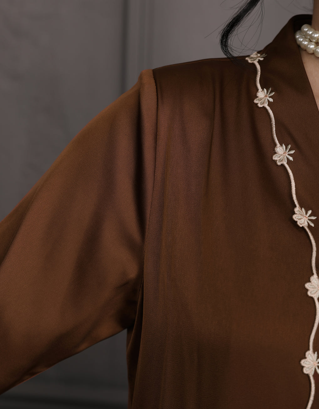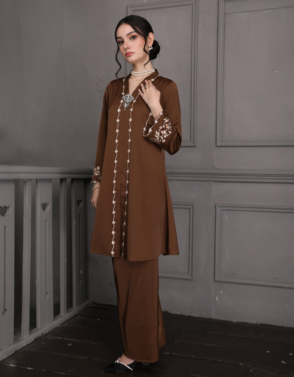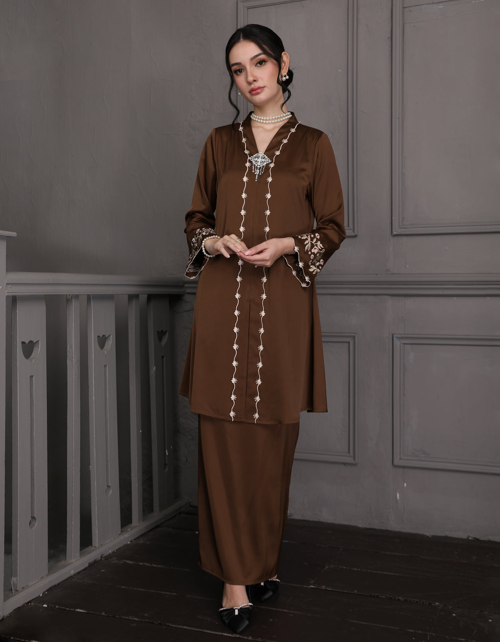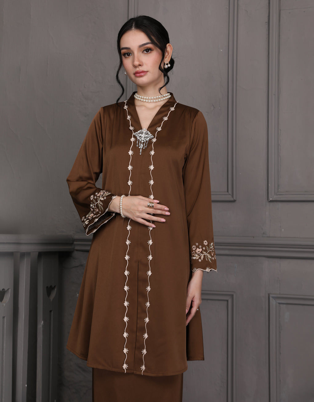 The 'Baju Kebaya Moden Winona' is crafted from Italian Silky Satin with a detailed Embroidered on the sleeves. Elegant and refined—perfect for festive or formal occasions.