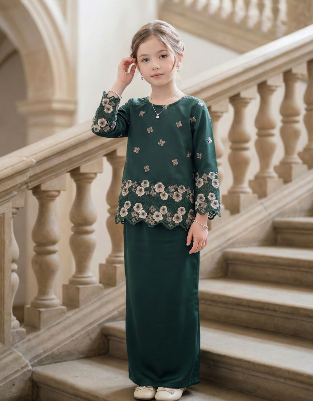 Crafted in a timeless Kedah cut, this piece ensures a comfortable fit for your little one. Delicate Floral Embroidered Lace and a subtly geometric hem create a graceful blend of femininity and elegance perfect for any occasion.