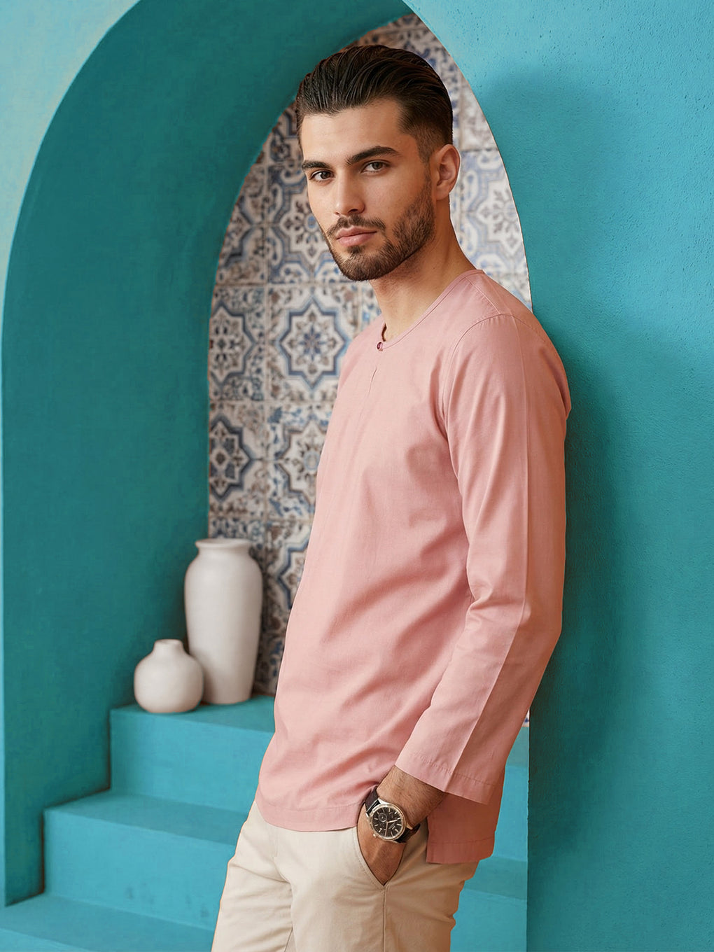 Elevate your style with premium cotton regular fit round neck kurta. The matched coloured buttons and long sleeves add a touch of sophistication, while the side pockets provides functionality and fashion. Perfect for any occasion, this kurta effortlessly combines comfort and elegance.