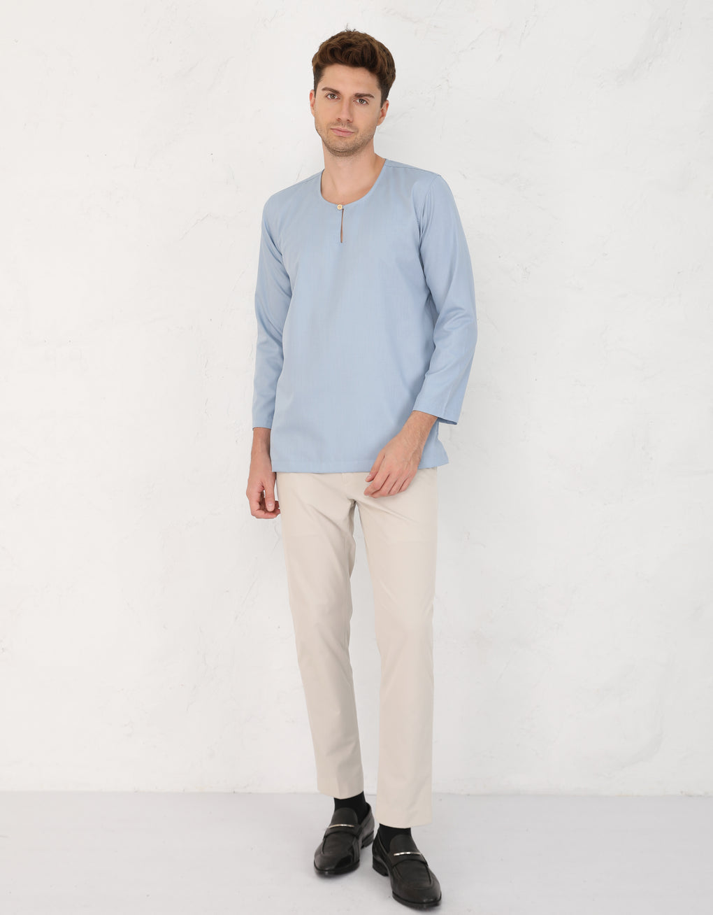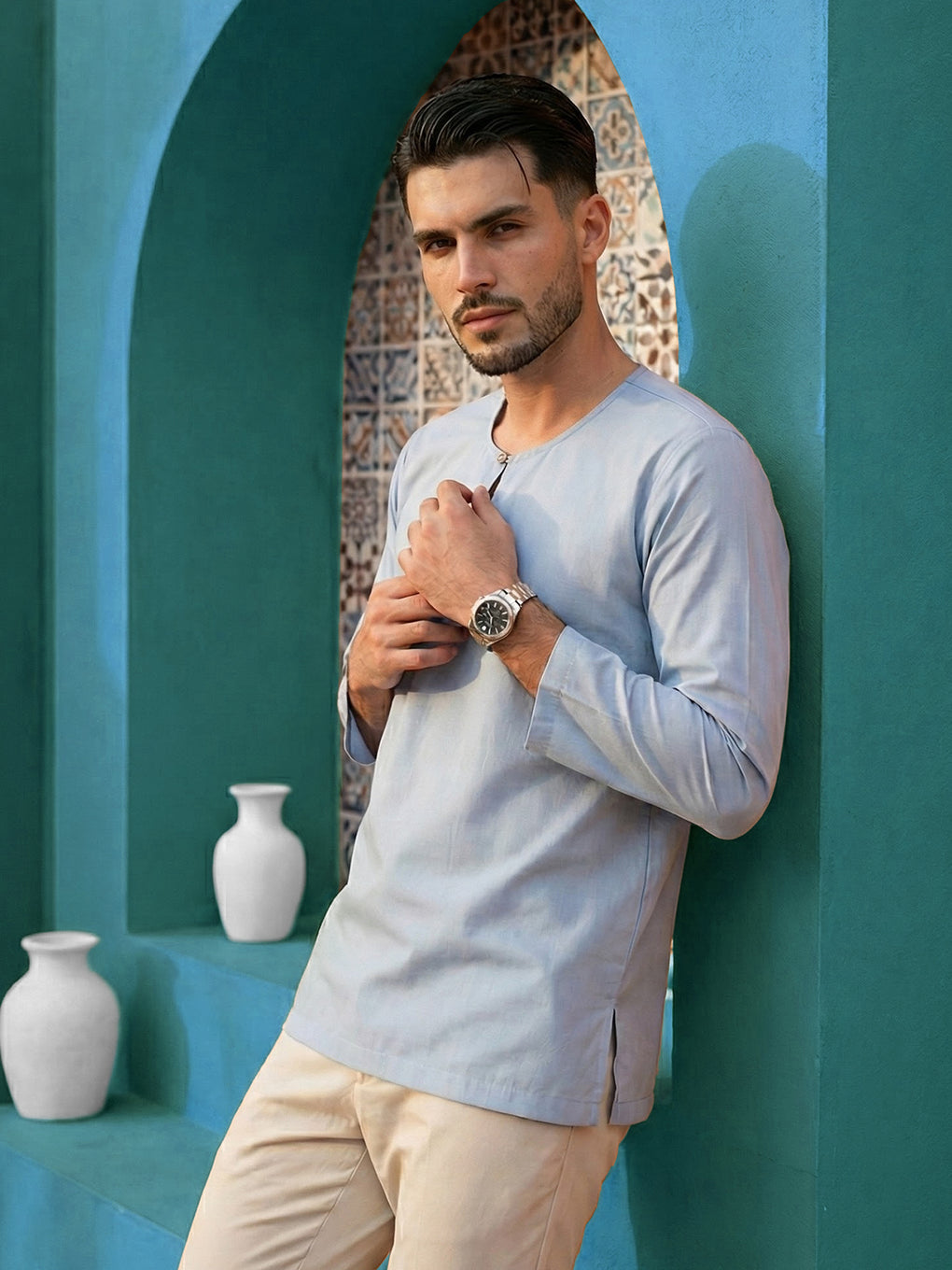 Elevate your style with premium cotton regular fit round neck kurta. The matched coloured buttons and long sleeves add a touch of sophistication, while the side pockets provides functionality and fashion. Perfect for any occasion, this kurta effortlessly combines comfort and elegance.