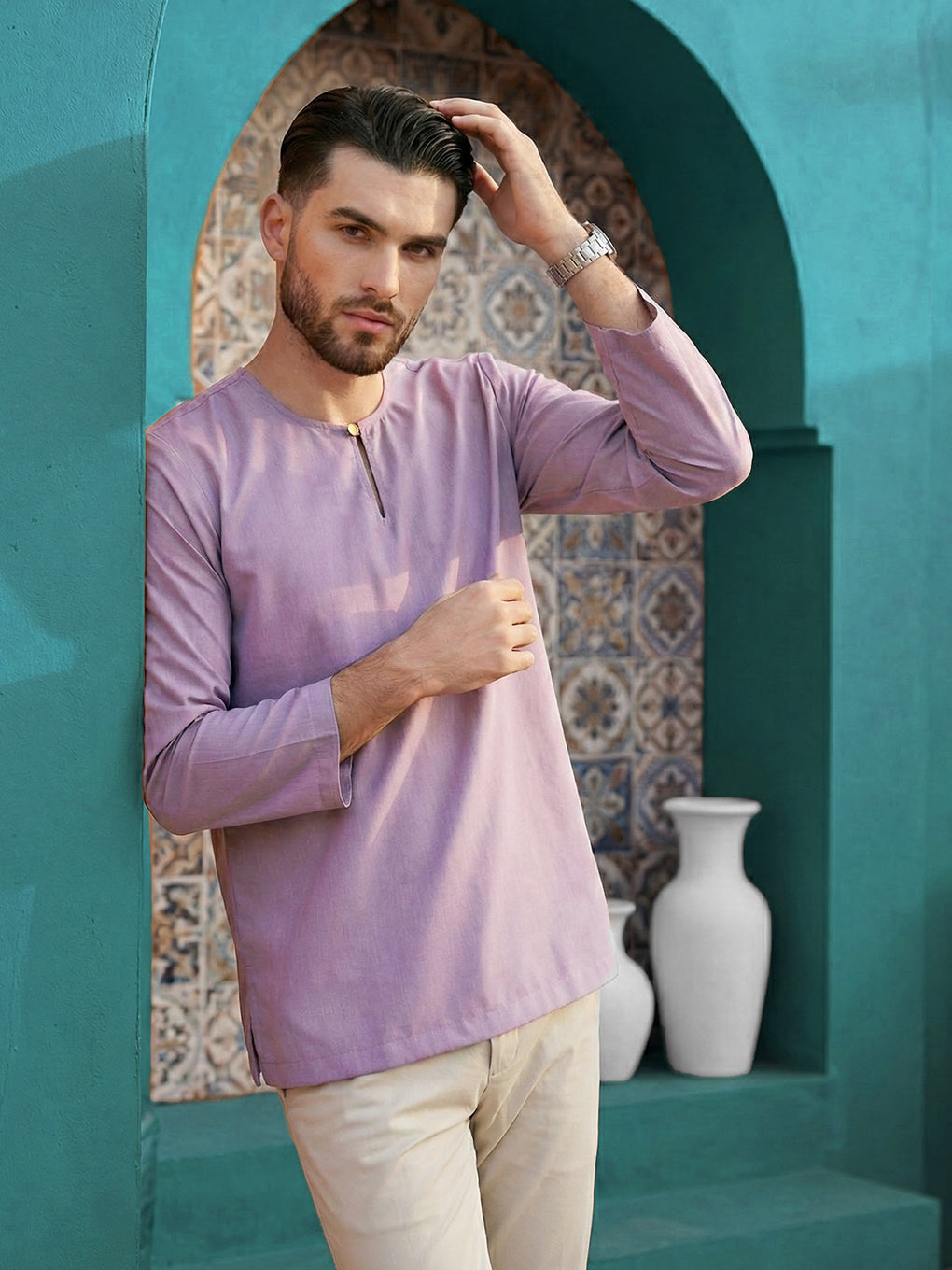 Elevate your style with premium cotton regular fit round neck kurta. The matched coloured buttons and long sleeves add a touch of sophistication, while the side pockets provides functionality and fashion. Perfect for any occasion, this kurta effortlessly combines comfort and elegance.