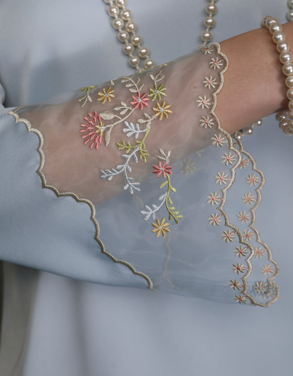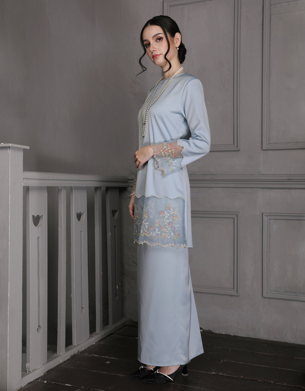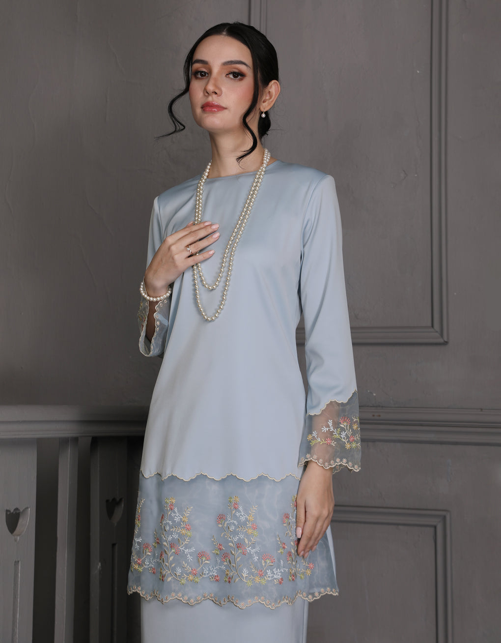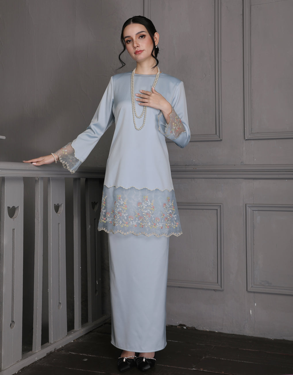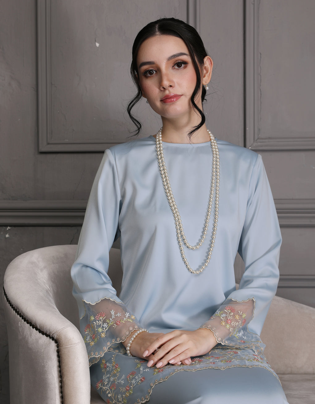 'Baju Kurung Pahang Moden Morana' blends tradition with a modern touch. Made from premium Italian Silky Satin, this piece features delicate embroidery on soft organdy that enhances its refined look. It offers both elegance and comfort in a long, flattering silhouette. A timeless choice for formal events or refined everyday wear.
