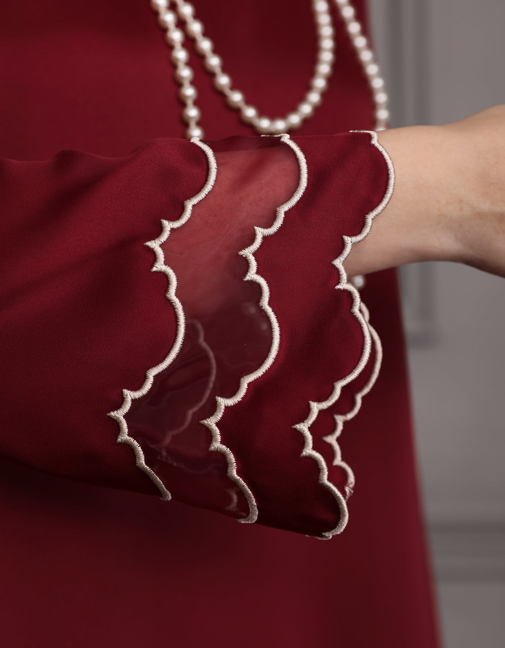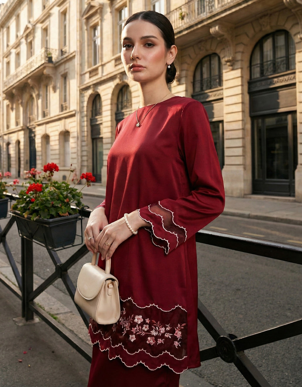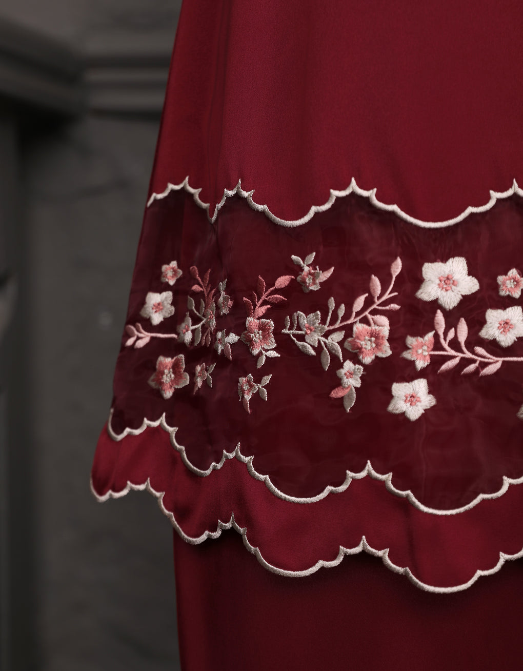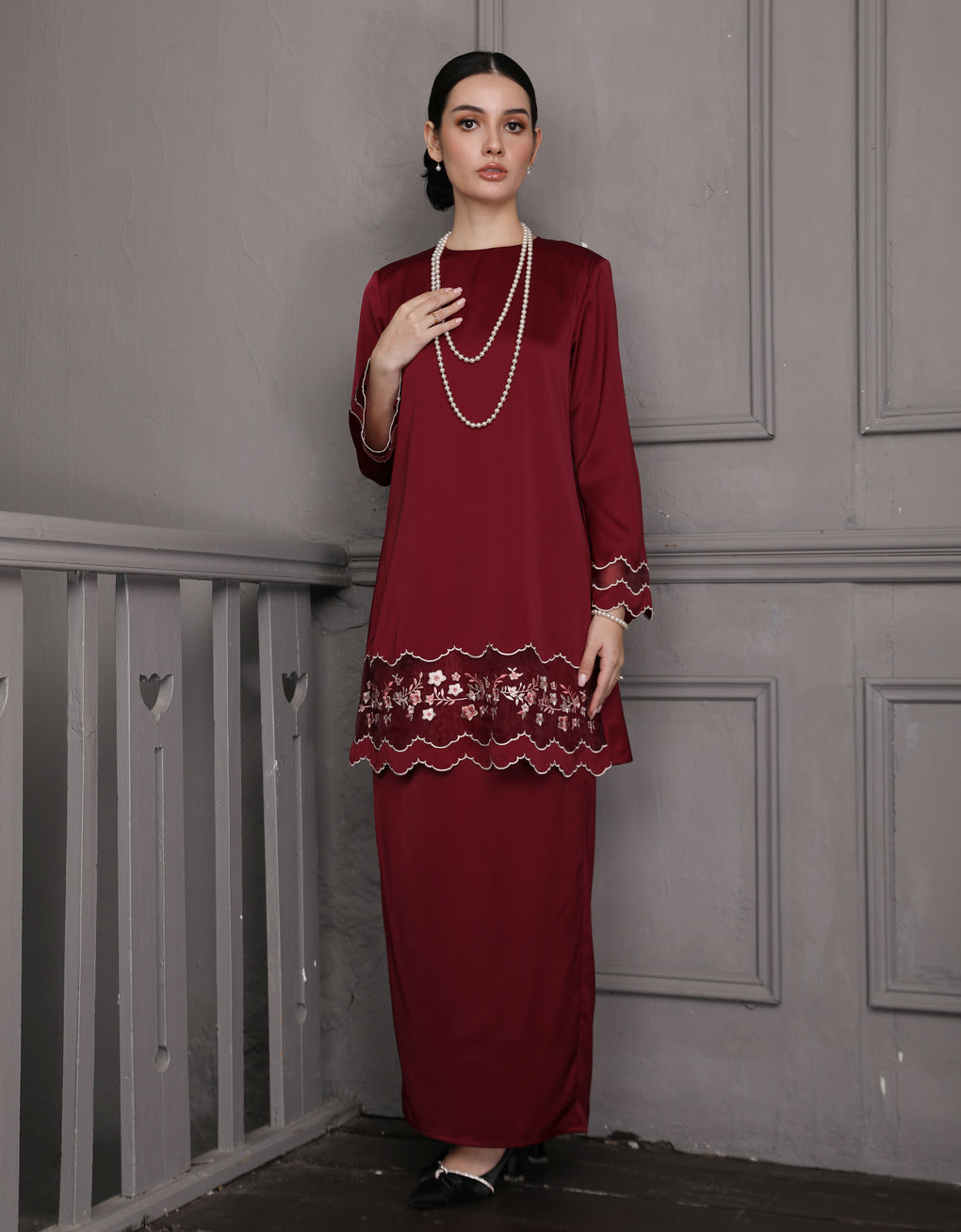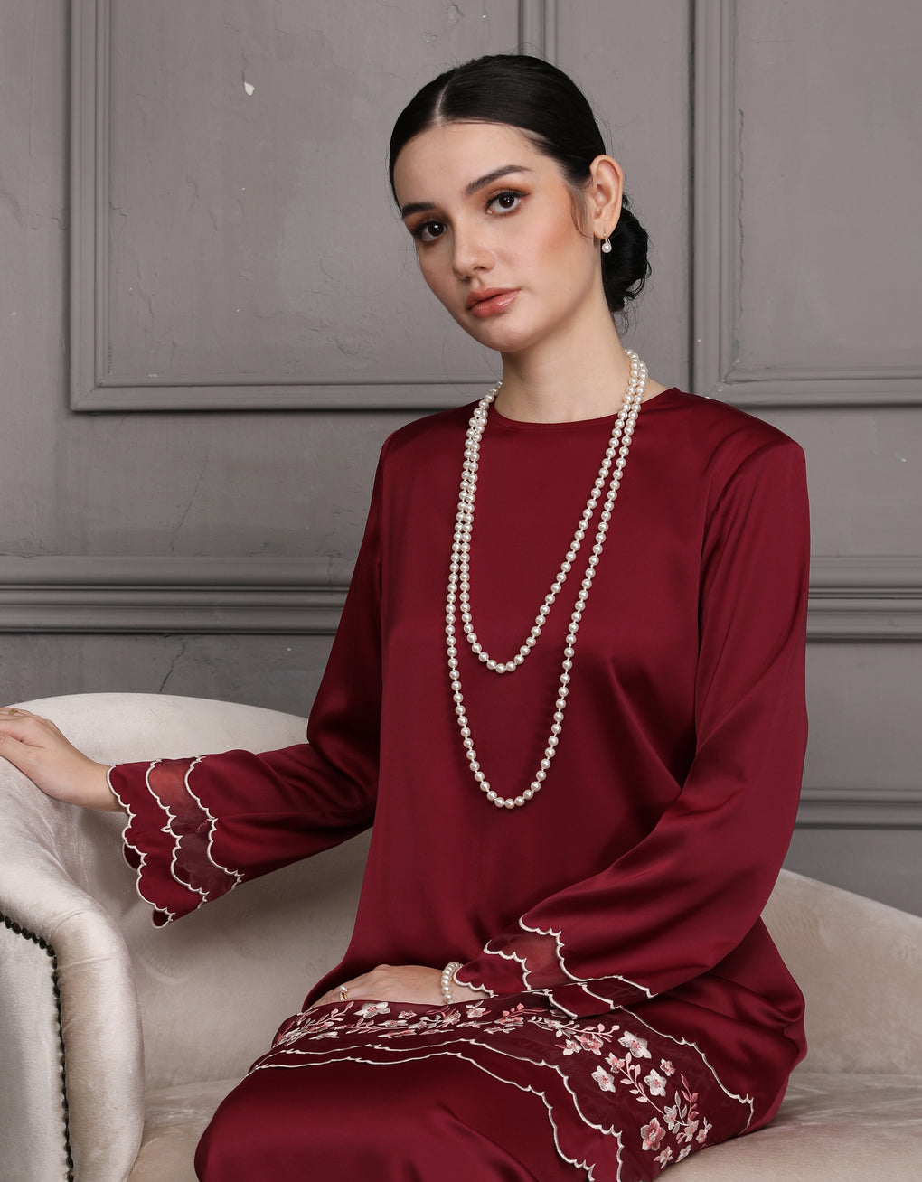 'Baju Kurung Pahang Moden Morana' blends tradition with a modern touch. Made from premium Italian Silky Satin, this piece features delicate embroidery on soft organdy that enhances its refined look. It offers both elegance and comfort in a long, flattering silhouette. A timeless choice for formal events or refined everyday wear.