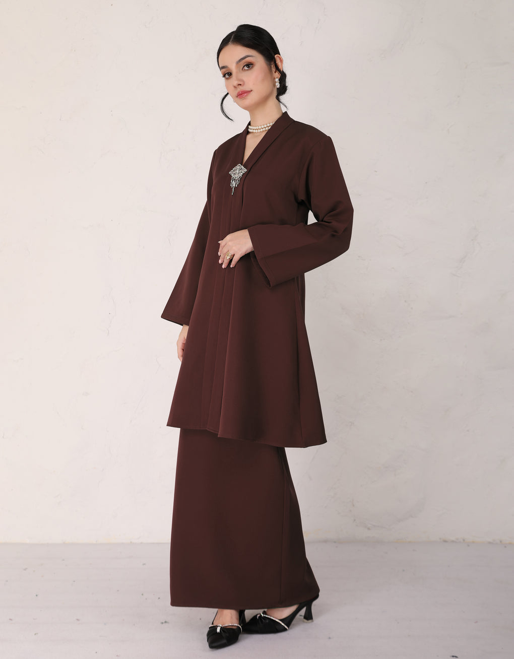 "Baju Kebarung Hawa" blends timeless tradition with modern grace. Crafted from premium premium Italian crepe - Its flowing, long silhouette offers cultural authenticity and all-day comfort-perfectly for formal events or refined daily wear. This piece honors heritage while embracing today’s fashion sensibilities.