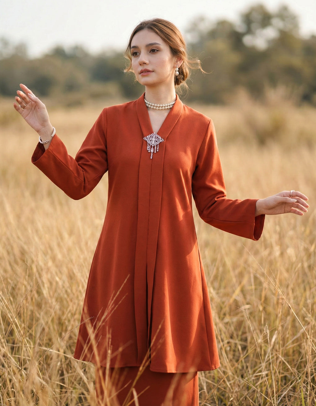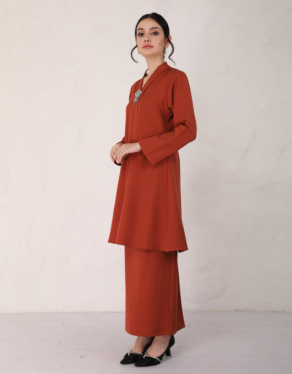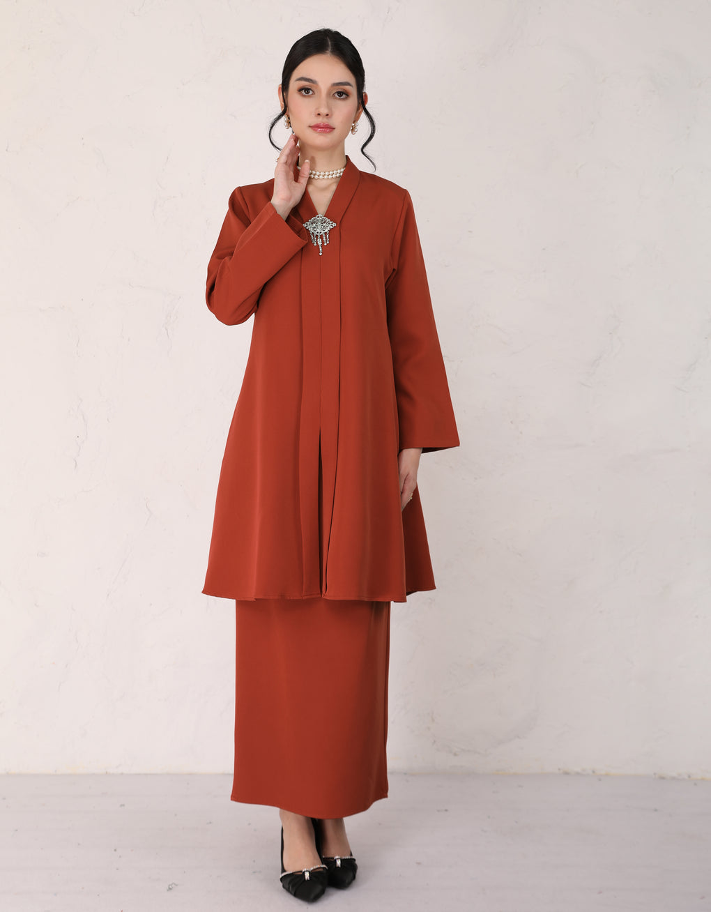 "Baju Kebarung Hawa" blends timeless tradition with modern grace. Crafted from premium premium Italian crepe - Its flowing, long silhouette offers cultural authenticity and all-day comfort-perfectly for formal events or refined daily wear. This piece honors heritage while embracing today’s fashion sensibilities.