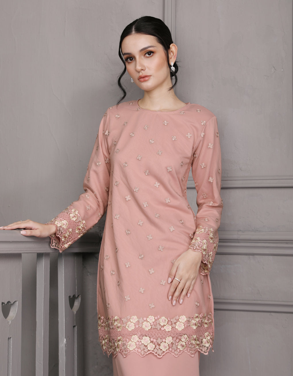 Crafted in a timeless Moden cut, this piece offers a comfortable fit. Delicate floral embroidered lace and a subtly geometric hem create a graceful blend of femininity and elegance perfect for any occasion.