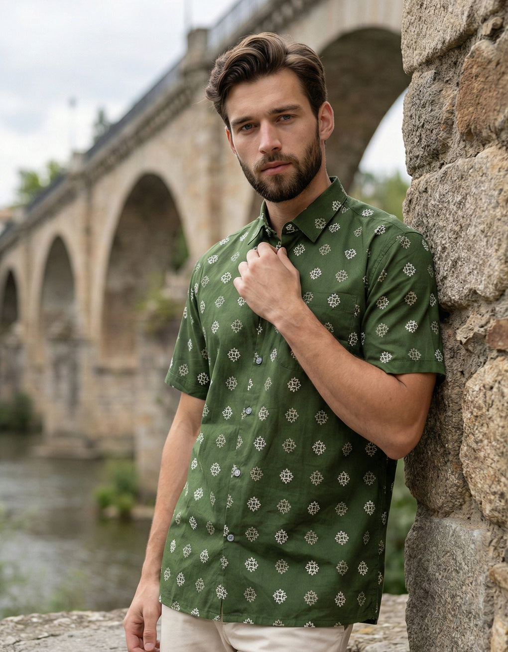 ✿ Regular fit collar shirt with short sleeves and featuring a chest patch pocket and button fastening on the front