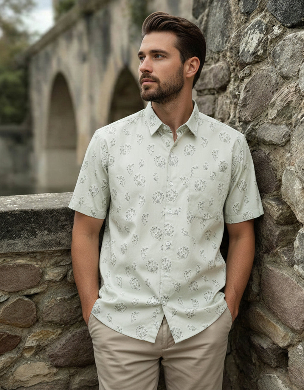 Regular fit collar shirt with short sleeves and featuring a chest patch pocket and button fastening on the front