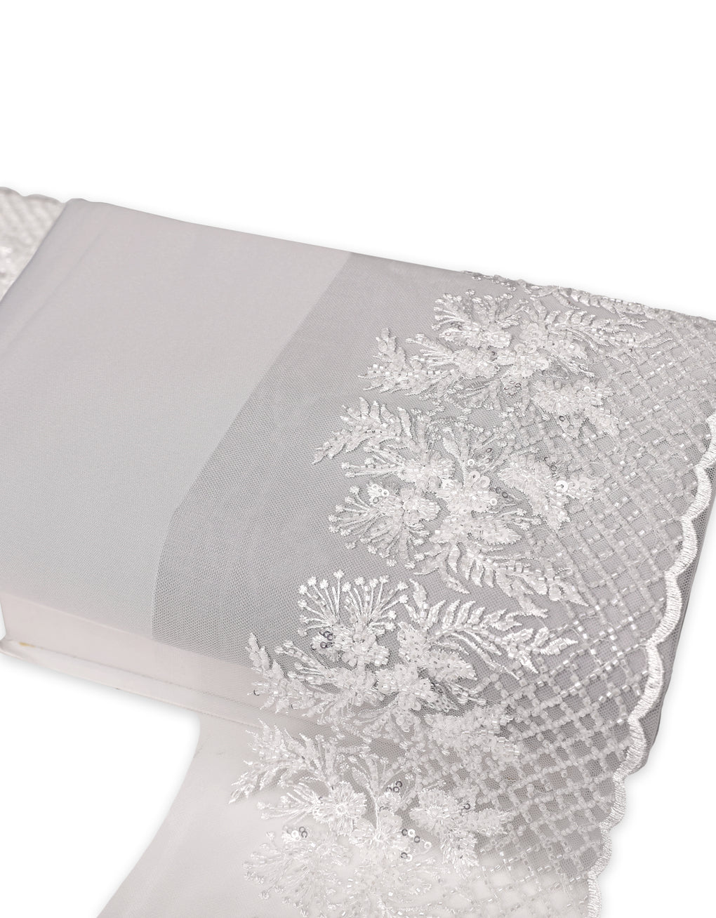 Aurora Blossom Beaded Border Lace Mix and Match is our latest collection that combined with 2 meters of beaded border lace and 4meters of 45 inches width plain pearl skin satin as it's full lining. This lace comes with minimalist beads and sequins and also delicate fabric with flower, leaf and abstract motifs. It is very suitable to make baju kurung, wedding dress and  dress.