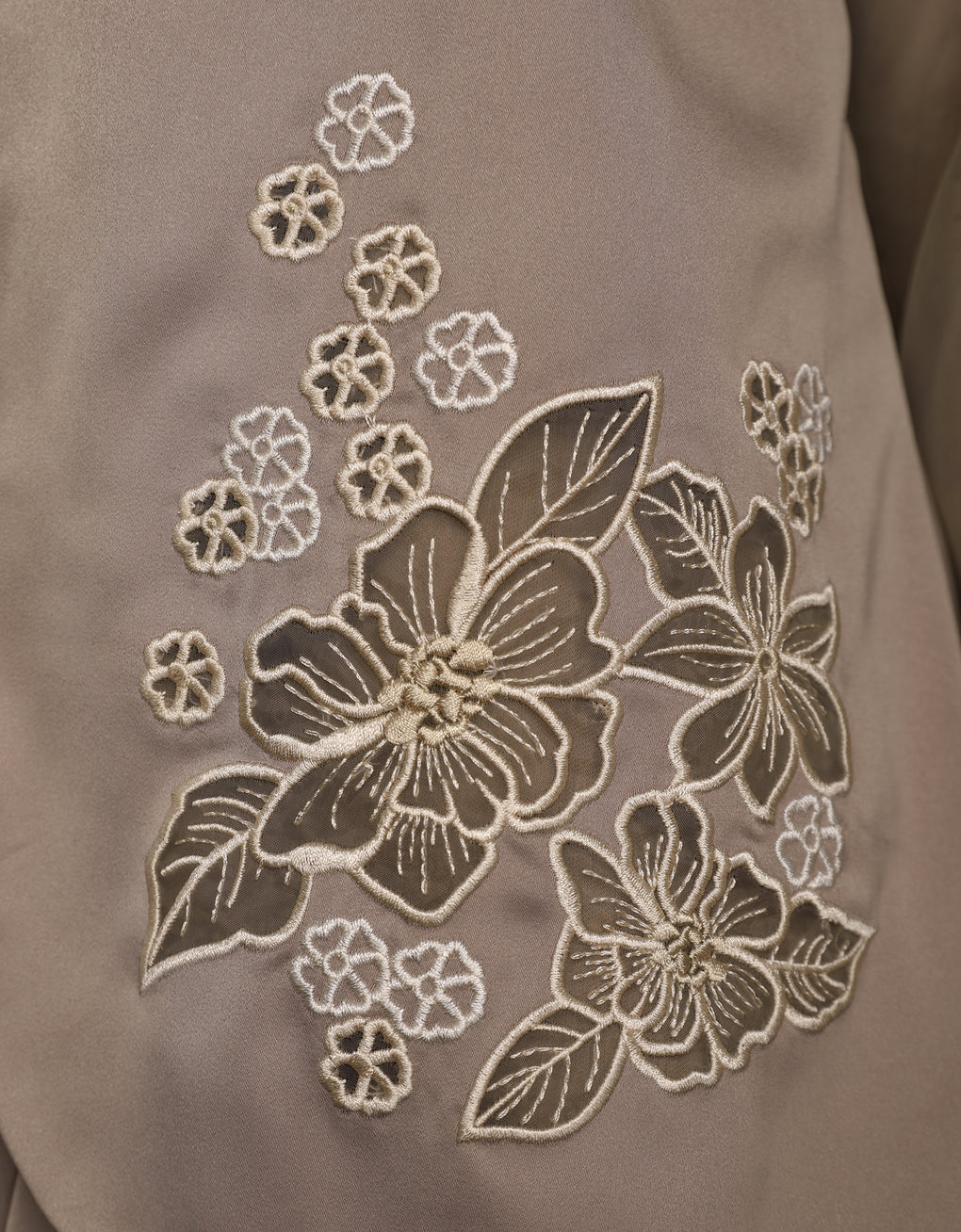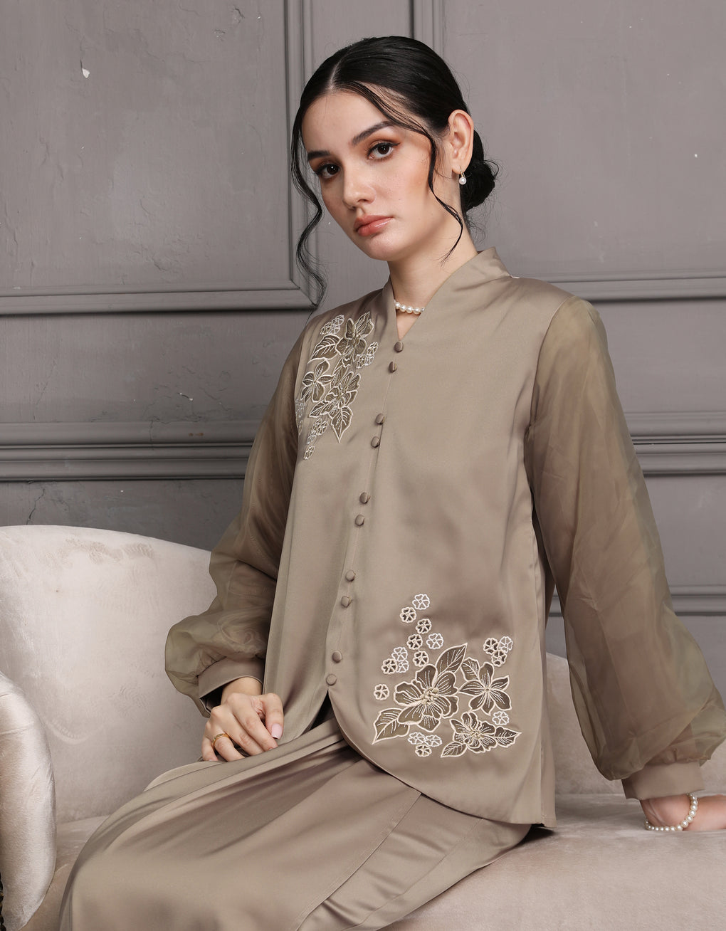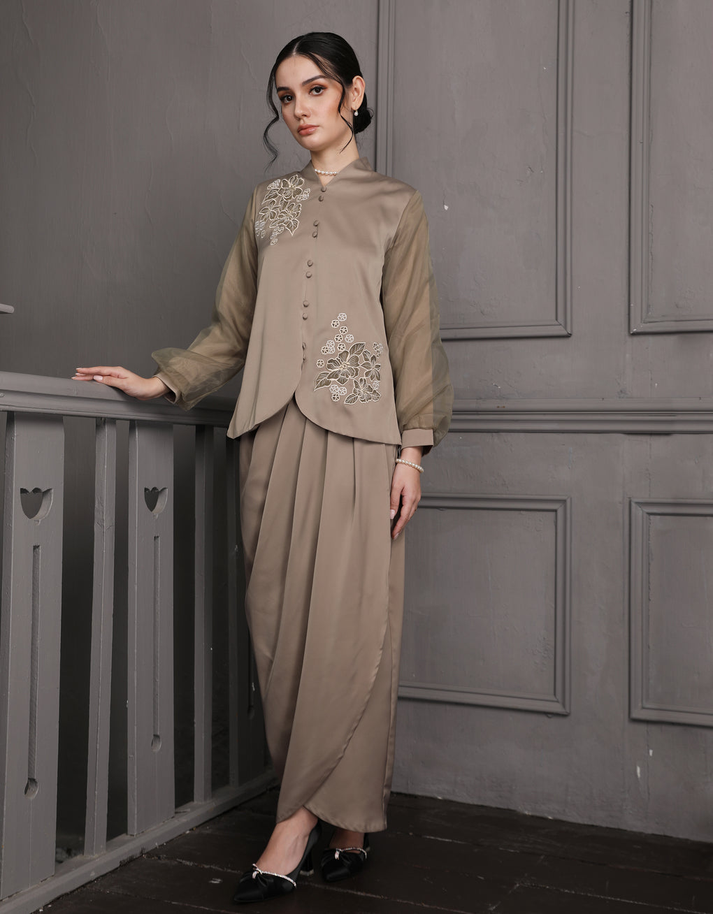 Crafted from premium satin, this "Baju Kurung Moden Alivia" features delicate floral patching embroidery and elegant button detailing. The flowy bishop sleeves and draped skirt complete the modern, graceful silhouette—perfect for formal or festive occasions.