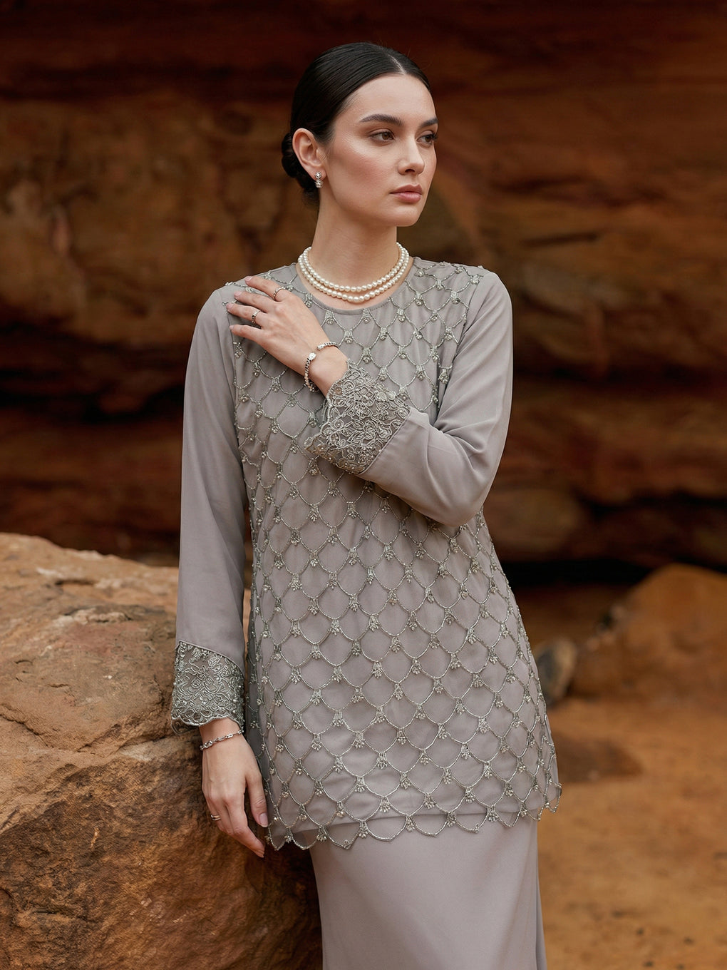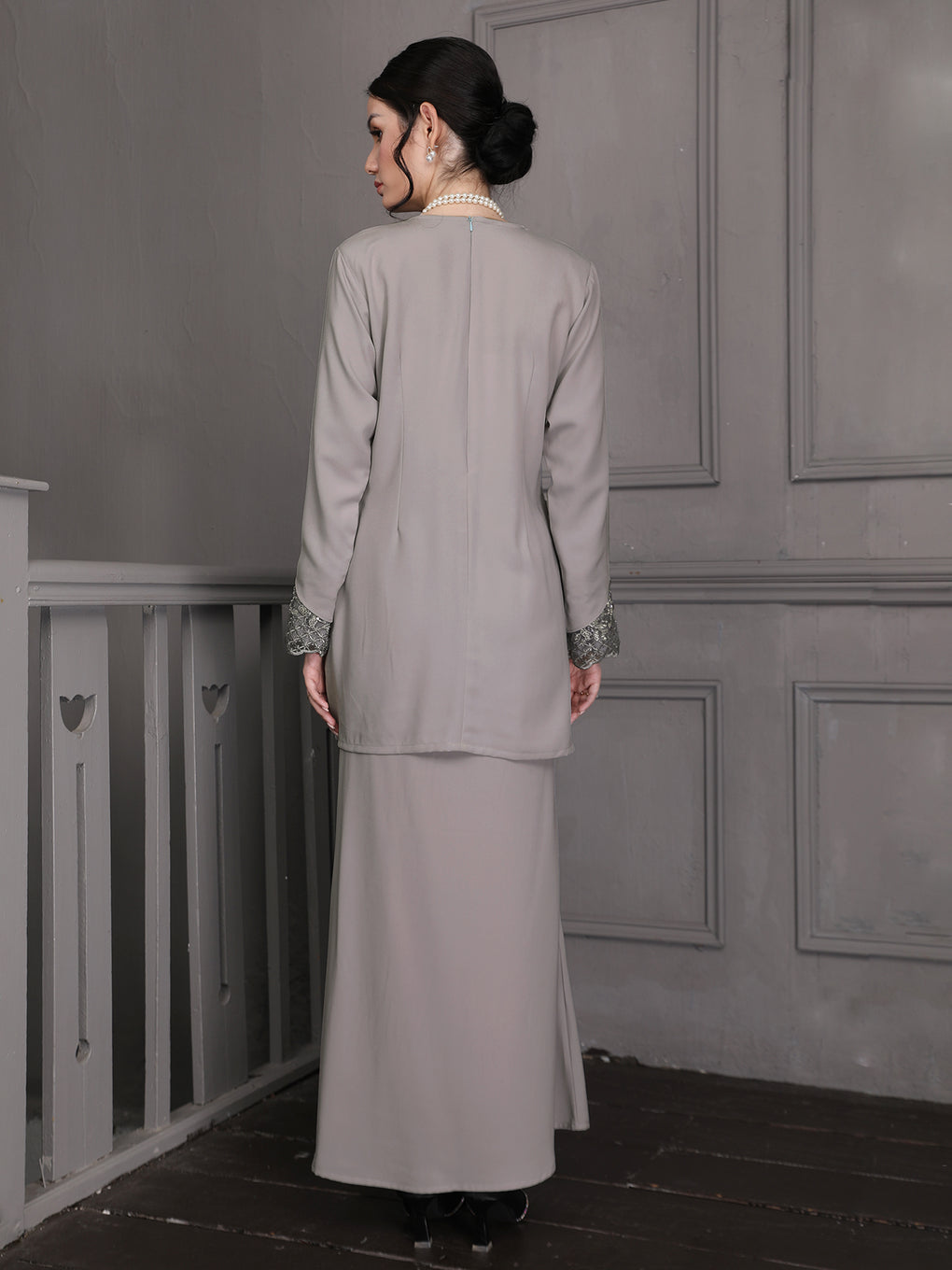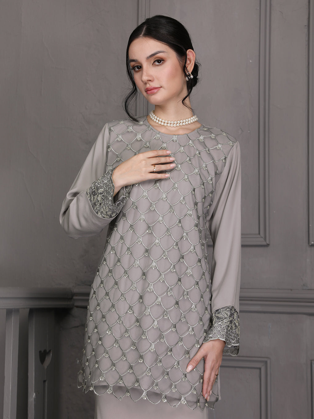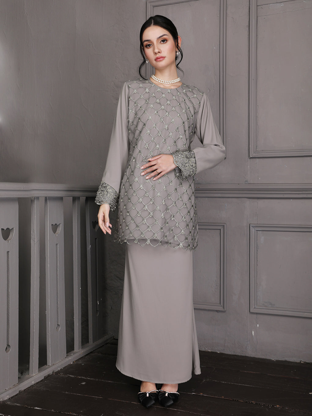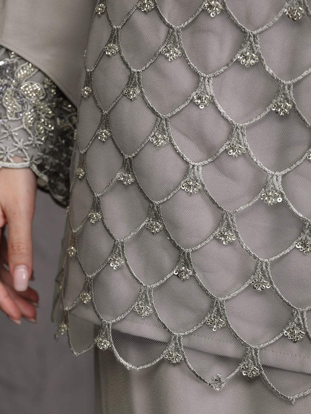 Baju Kurung Moden Idalia Luxurious and exclusive beaded lace delicately sewn for a rich and stunning look. The interlining are made of soft hand-feel jojo crepe fabric.