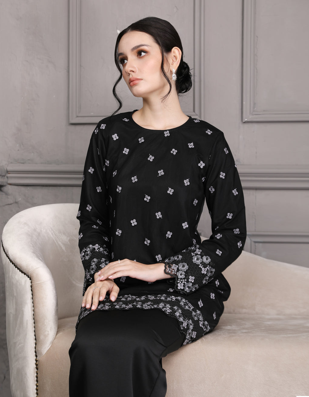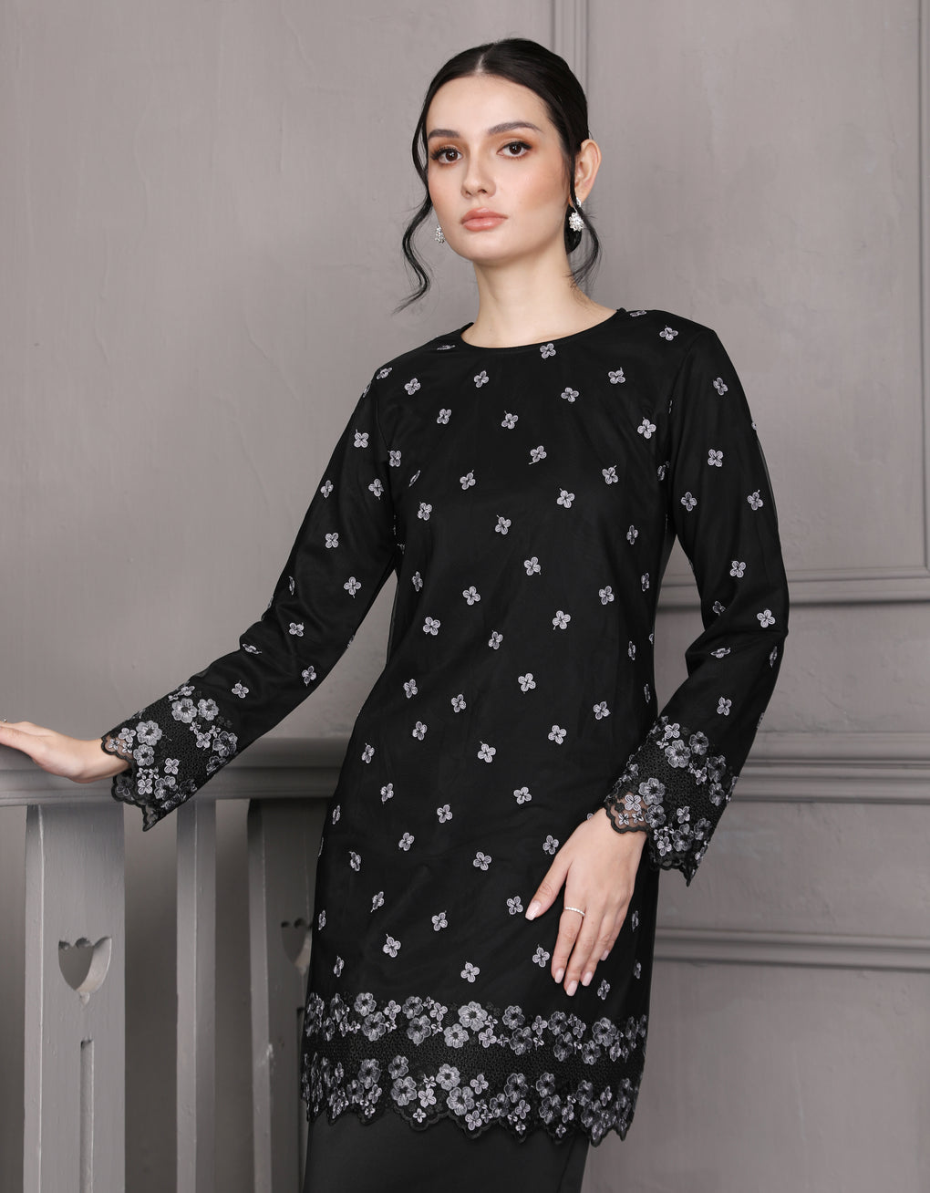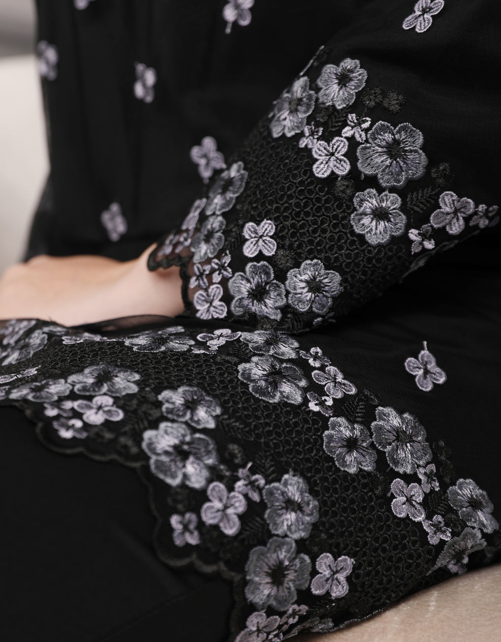 Crafted in a timeless Moden cut, this piece offers a comfortable fit. Delicate floral embroidered lace and a subtly geometric hem create a graceful blend of femininity and elegance perfect for any occasion.