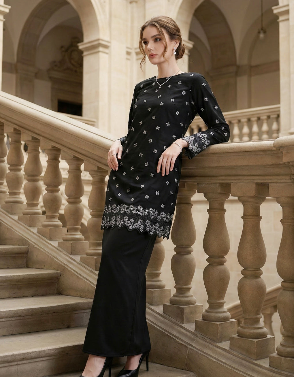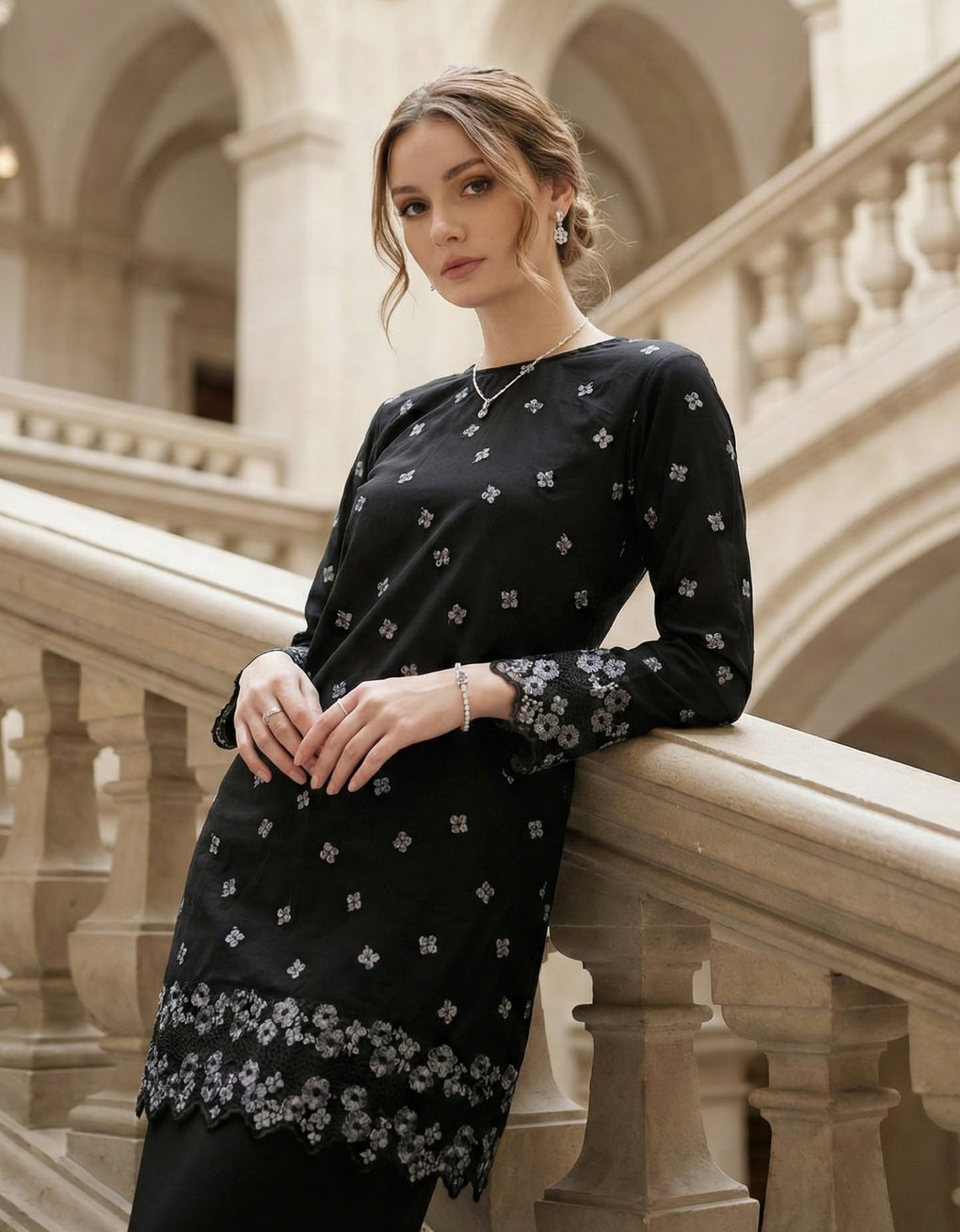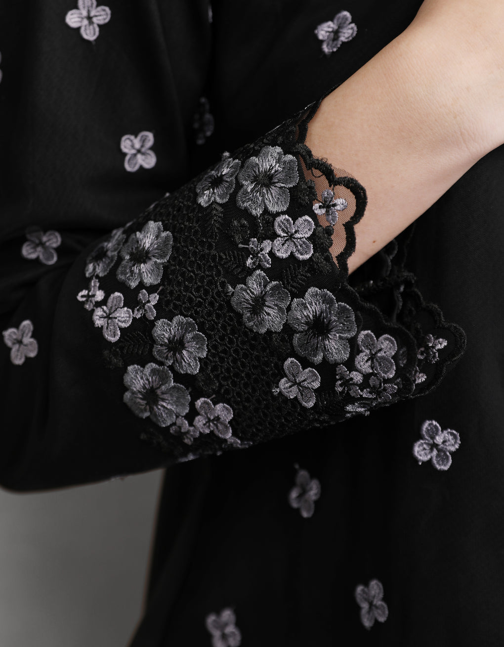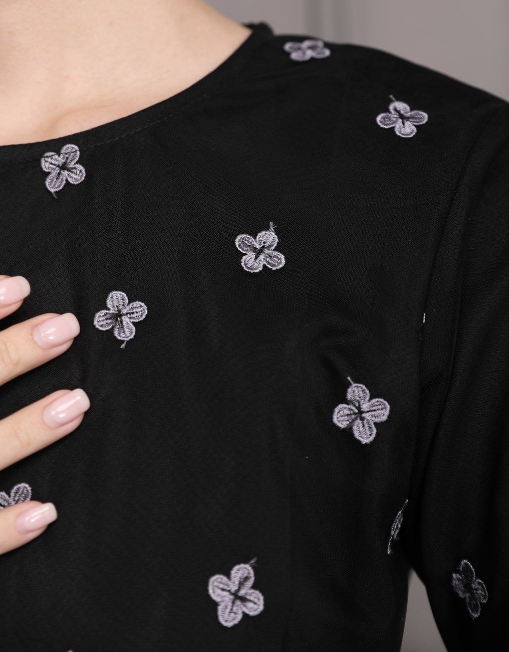 Crafted in a timeless Moden cut, this piece offers a comfortable fit. Delicate floral embroidered lace and a subtly geometric hem create a graceful blend of femininity and elegance perfect for any occasion.
