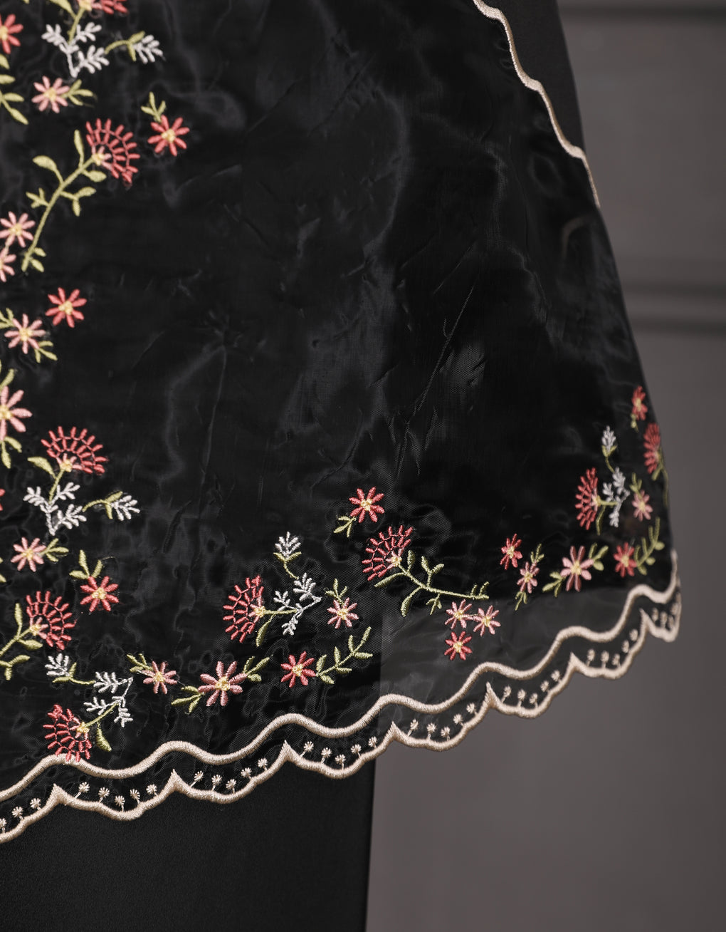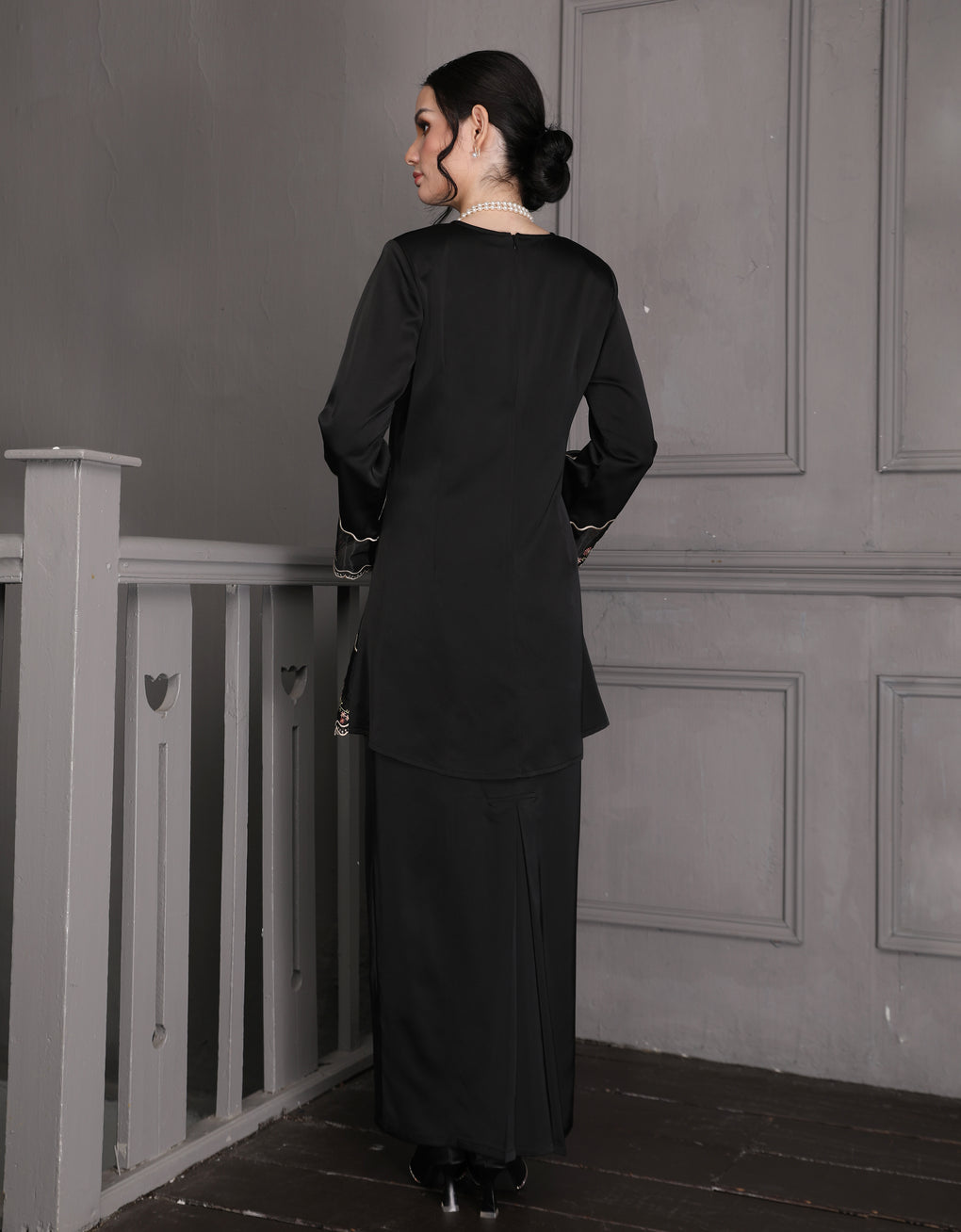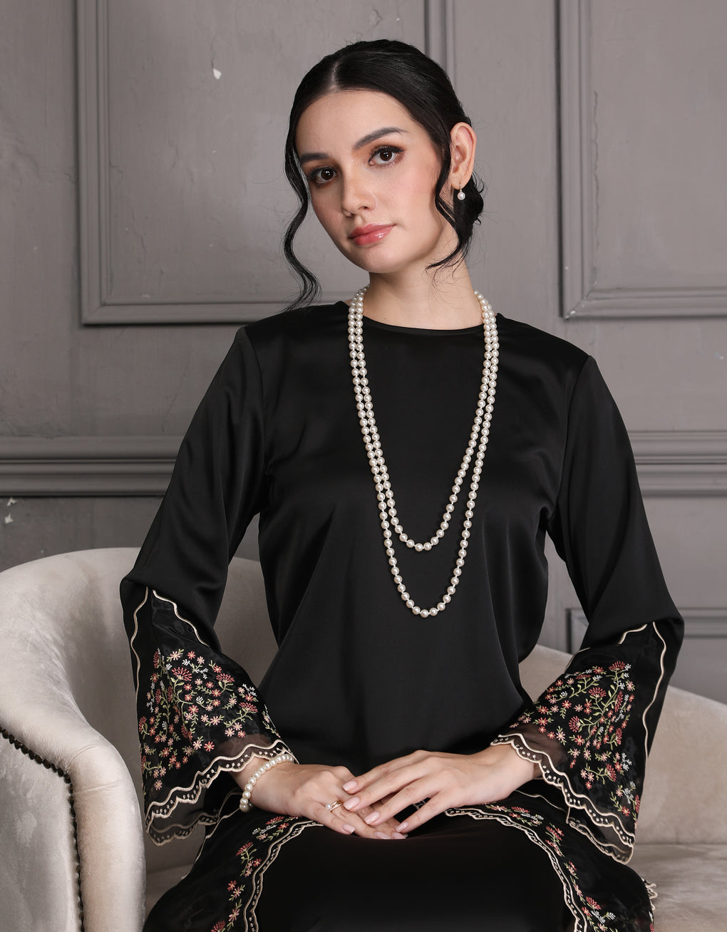'Baju Kurung Pahang Moden Aurelia' blends tradition with a modern touch. Made from premium Italian Silky Satin, this piece features delicate embroidery on soft organdy that enhances its refined look. It offers both elegance and comfort in a long, flattering silhouette. A timeless choice for formal events or refined everyday wear.