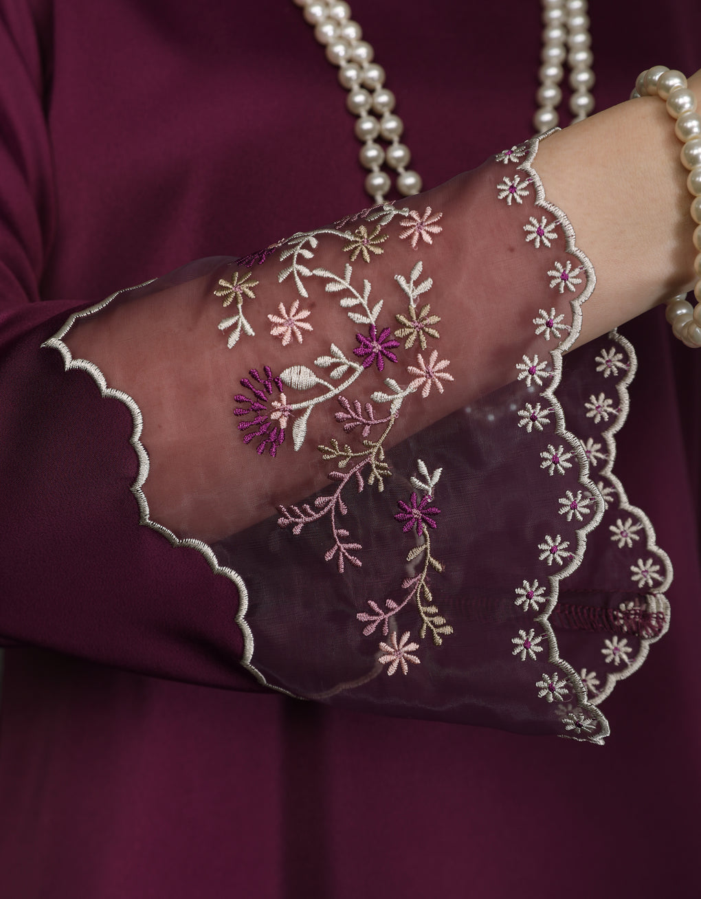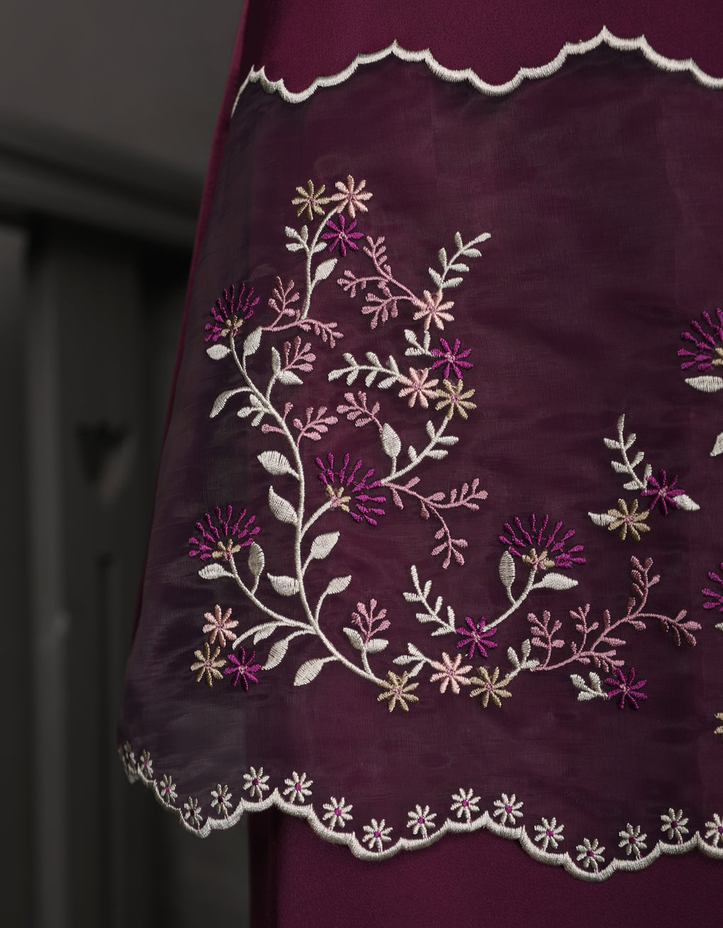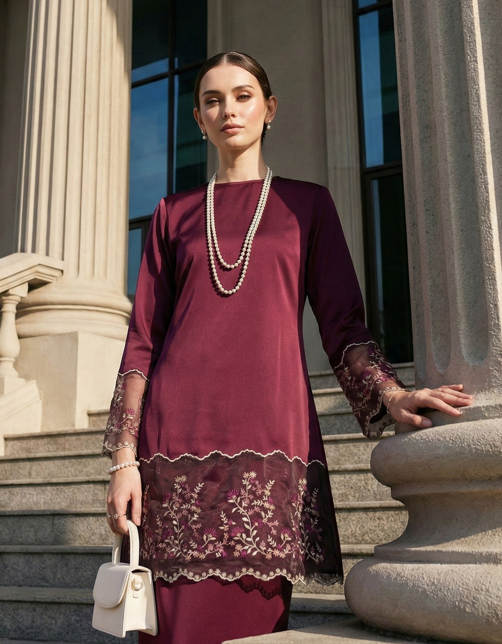 'Baju Kurung Pahang Moden Morana' blends tradition with a modern touch. Made from premium Italian Silky Satin, this piece features delicate embroidery on soft organdy that enhances its refined look. It offers both elegance and comfort in a long, flattering silhouette. A timeless choice for formal events or refined everyday wear.