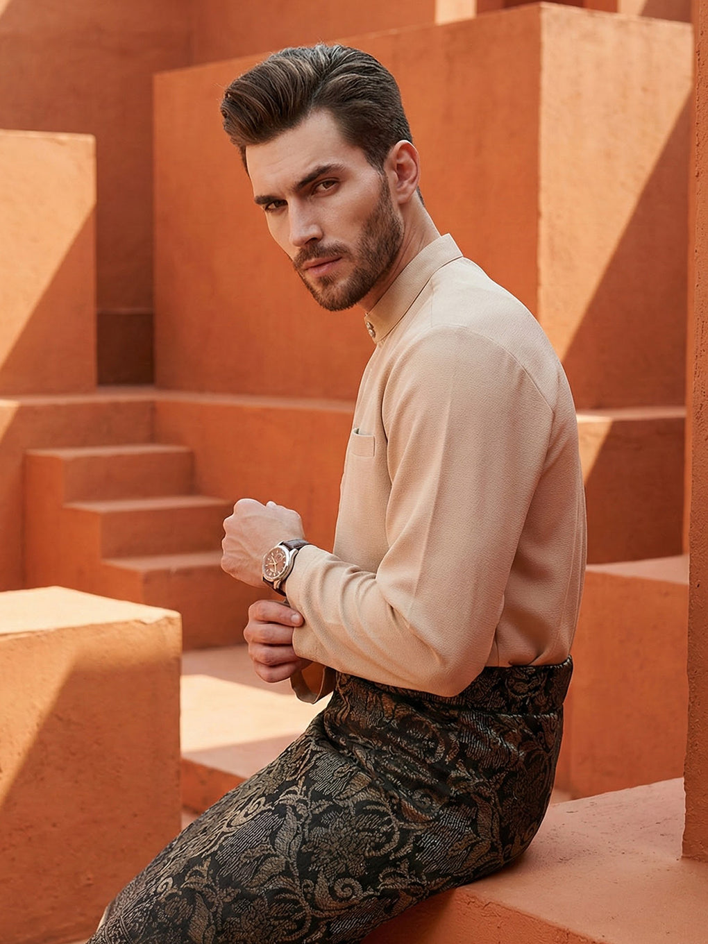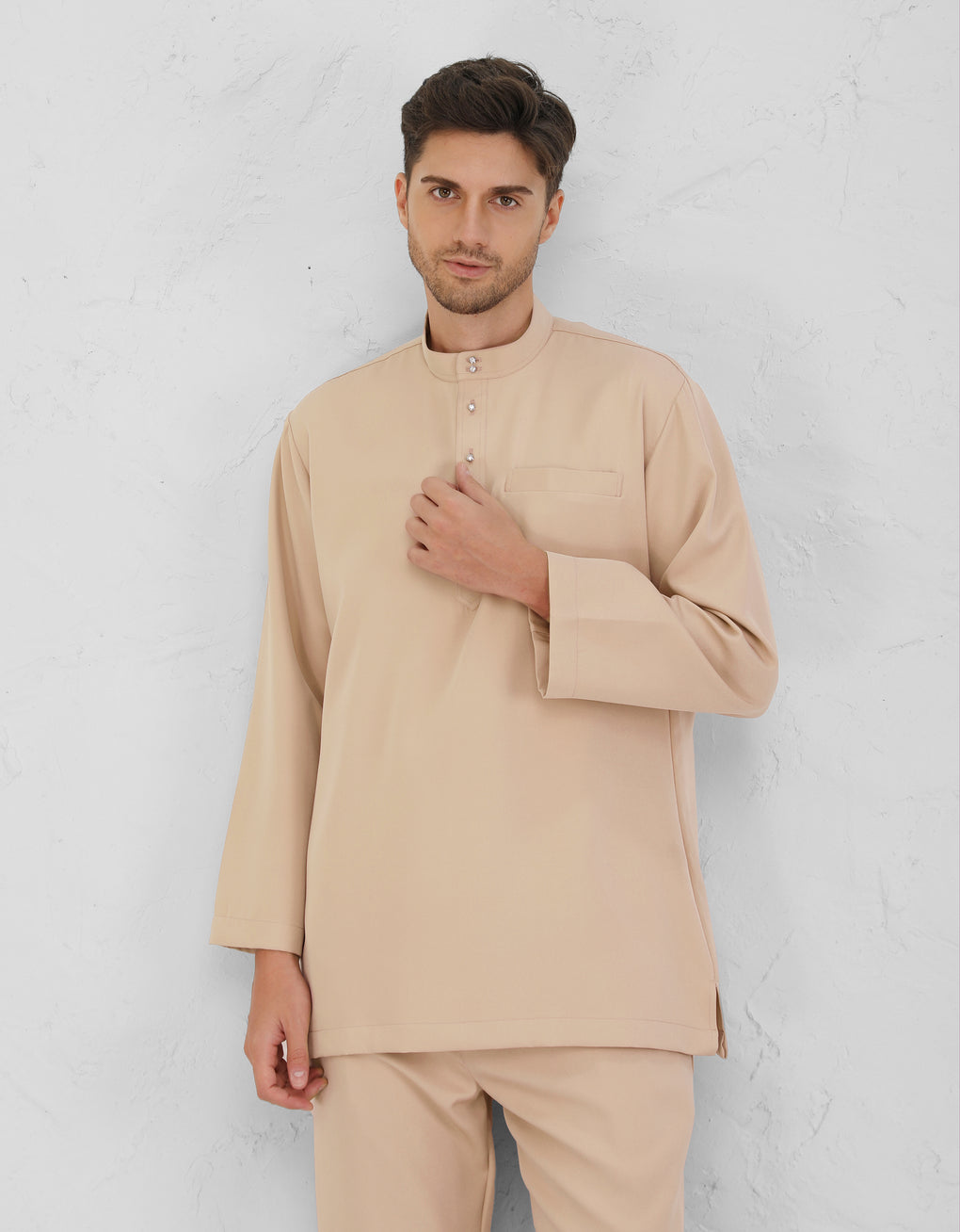 A Modern take on the classic Baju Melayu Cekak Musang  - clean lines, tailored fit, and refined details for a sleek traditional look. Perfect for Raya, Wedding or formal events. This timeless piece blends heritage with cotemporary style.