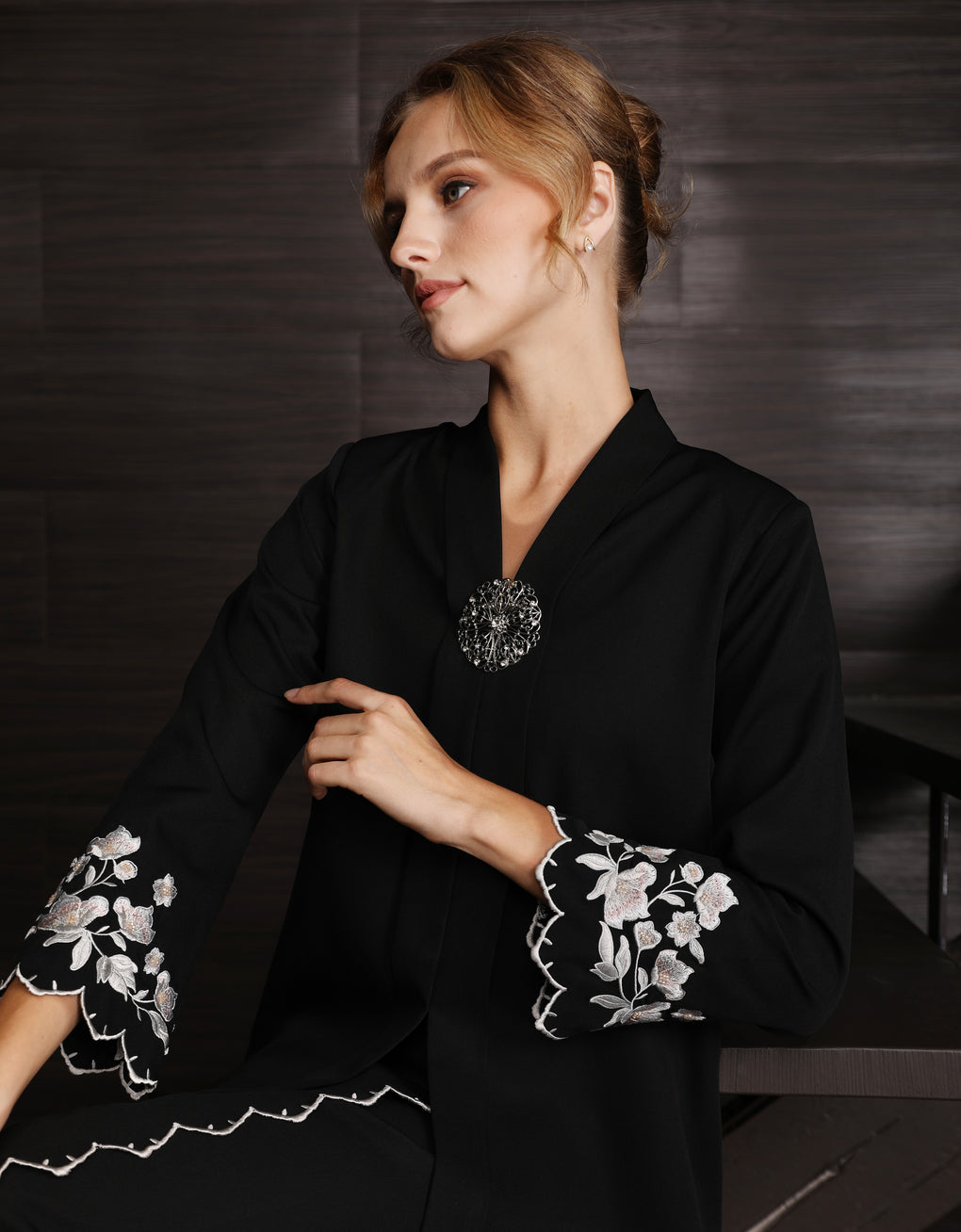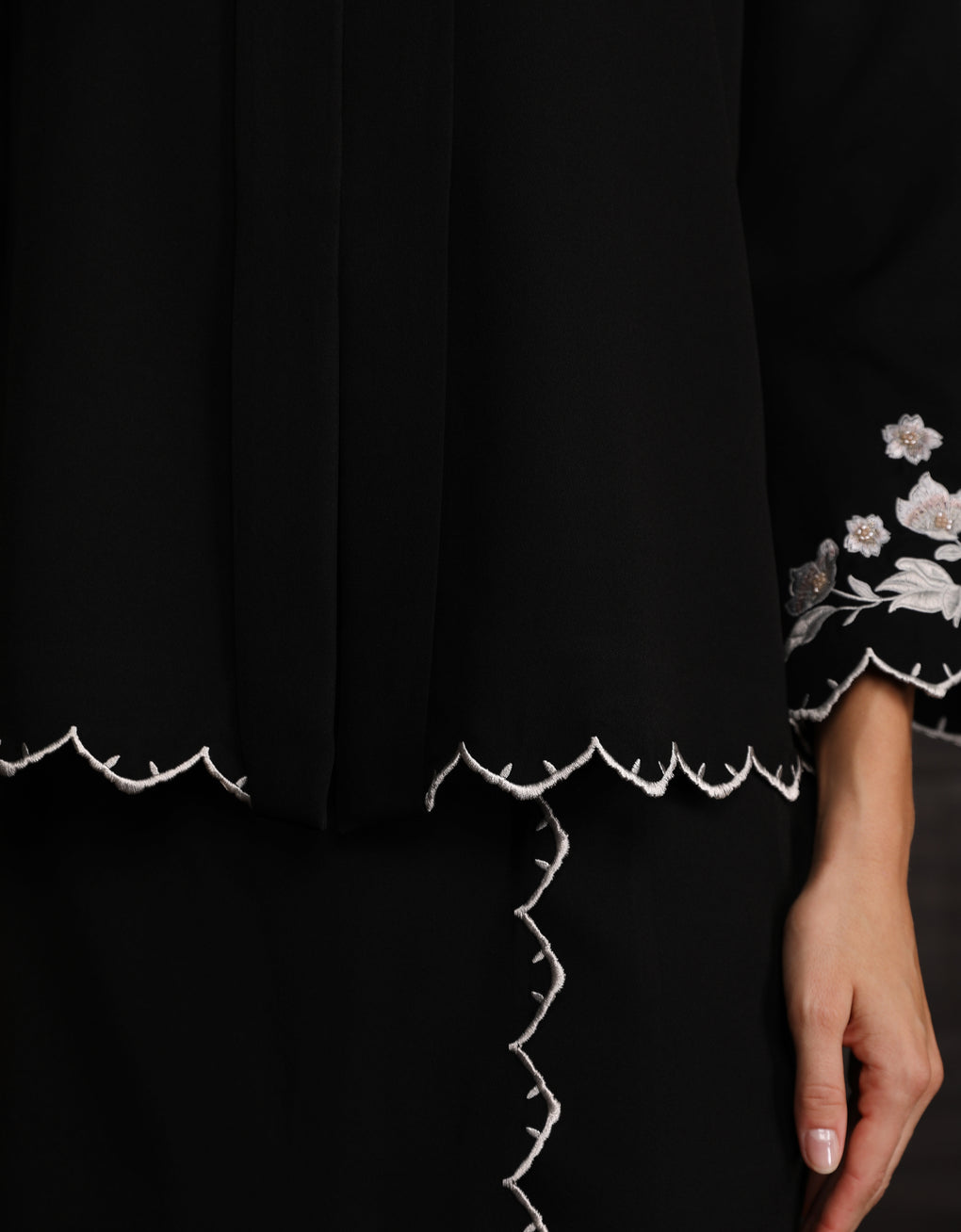 Crafted from premium Italian crepe and featuring intricate embroidery, this baju kebaya offers a form fitting silhouette with a slight stretch for comfort. Its soft touch to the skin makes it breathable and luxurious.