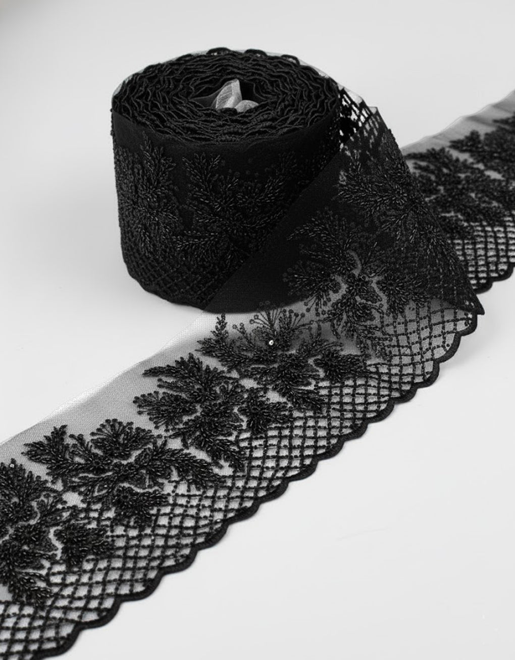 Beaded Border lace  is a fine fabrics that comes in floral and abstract pattern and also with minimalist sequins and beads. Giving the highest recognition for the exquisite vibe of femininity to the wearer. It also has a good drapability.