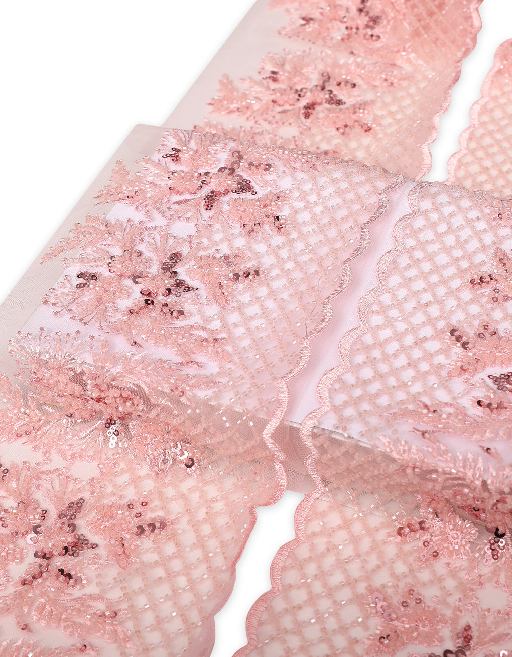 Beaded Border lace  is a fine fabrics that comes in floral and abstract pattern and also with minimalist sequins and beads. Giving the highest recognition for the exquisite vibe of femininity to the wearer. It also has a good drapability.