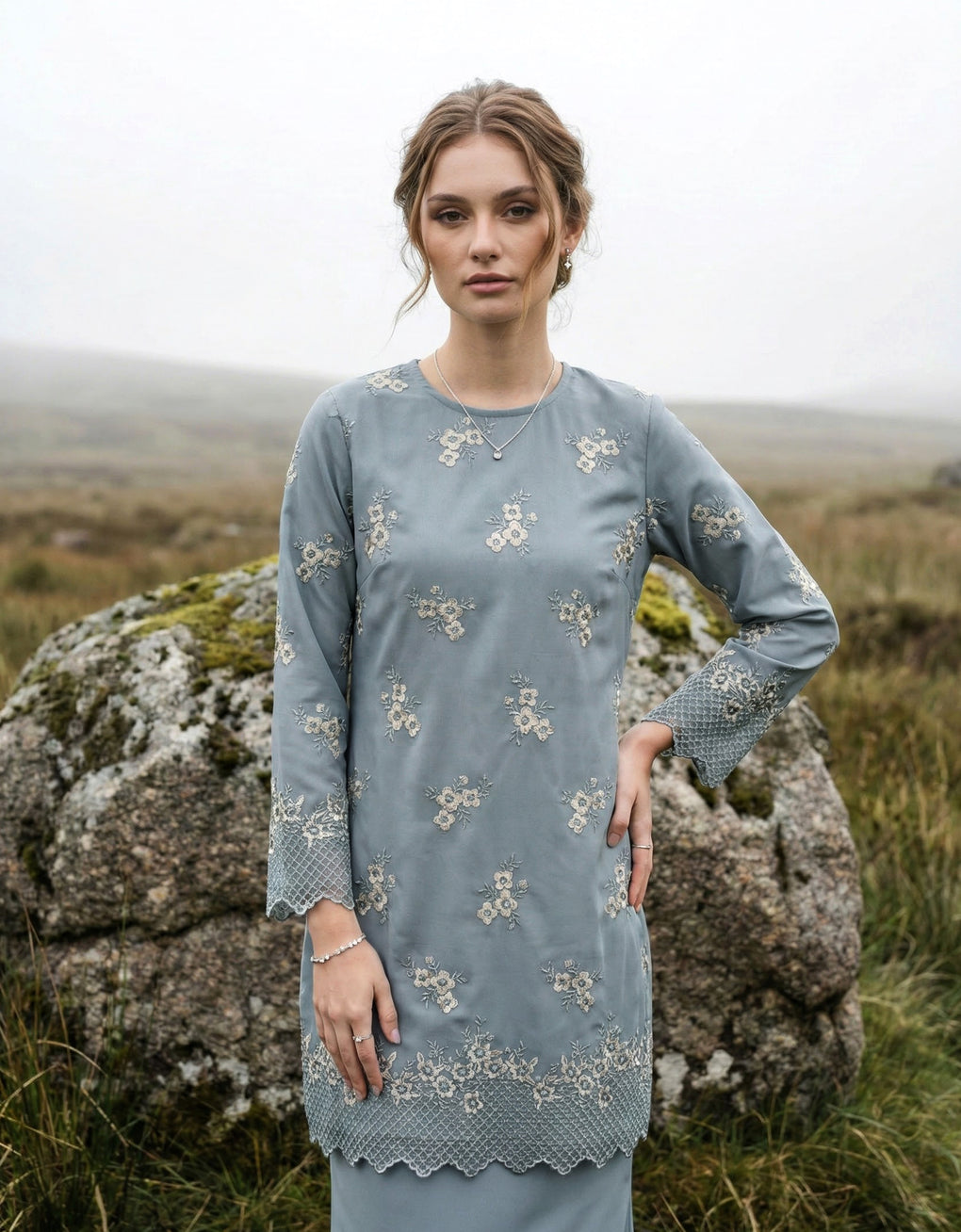 Crafted in a timeless Moden cut, this piece offers a comfortable fit. Delicate floral embroidered lace and a subtly geometric hem create a graceful blend of femininity and elegance perfect for any occasion.