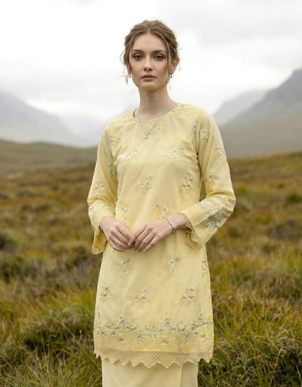 Crafted in a timeless Moden cut, this piece offers a comfortable fit. Delicate floral embroidered lace and a subtly geometric hem create a graceful blend of femininity and elegance perfect for any occasion.