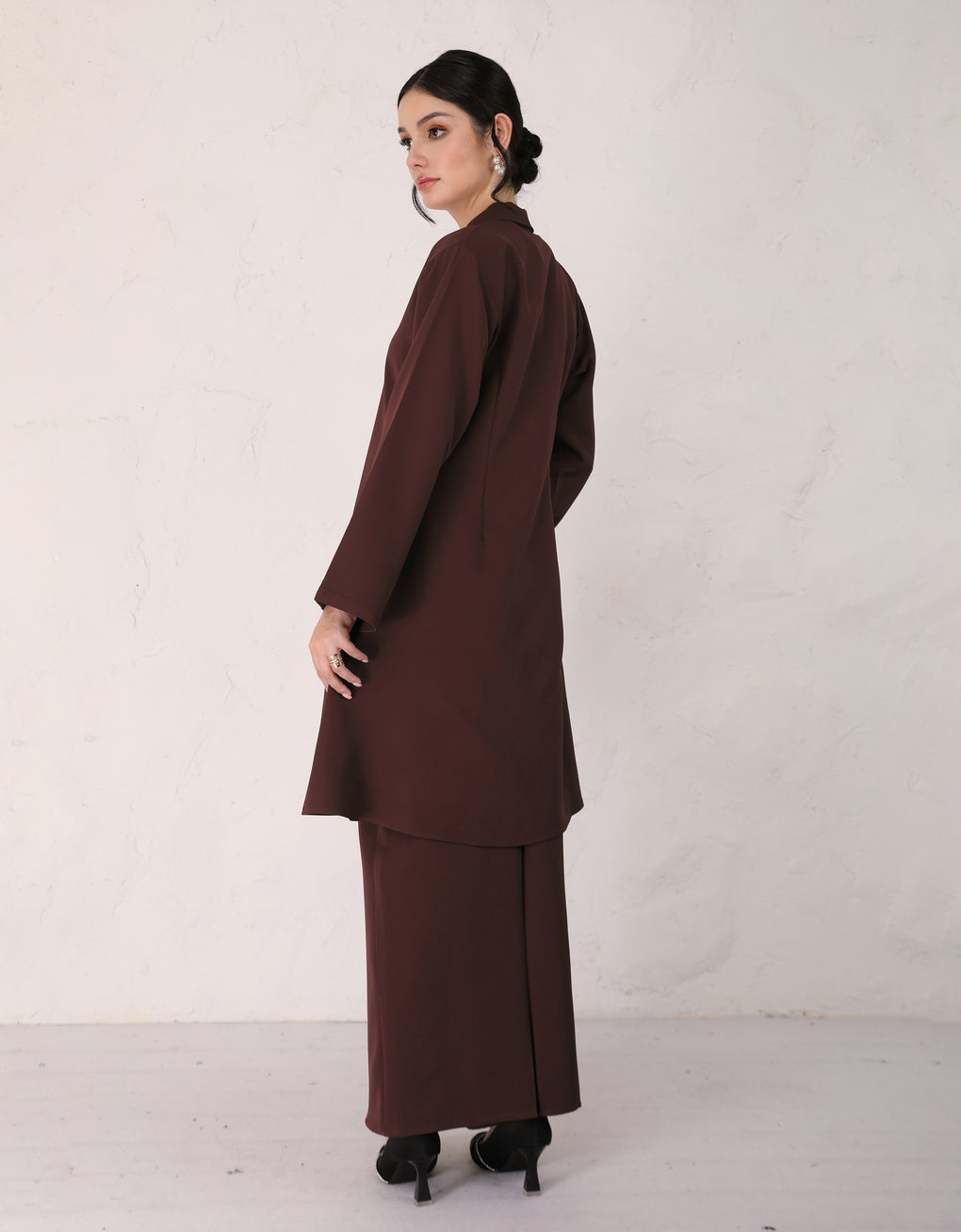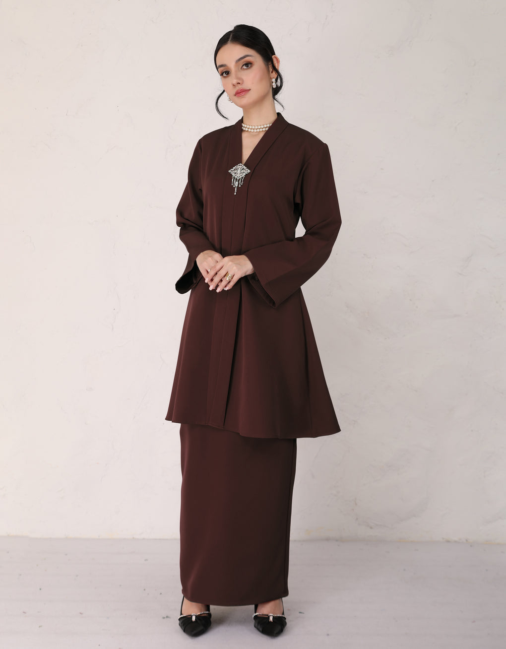 "Baju Kebarung Hawa" blends timeless tradition with modern grace. Crafted from premium premium Italian crepe - Its flowing, long silhouette offers cultural authenticity and all-day comfort-perfectly for formal events or refined daily wear. This piece honors heritage while embracing today’s fashion sensibilities.