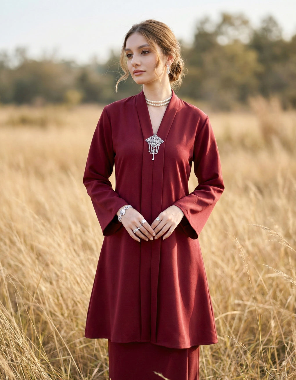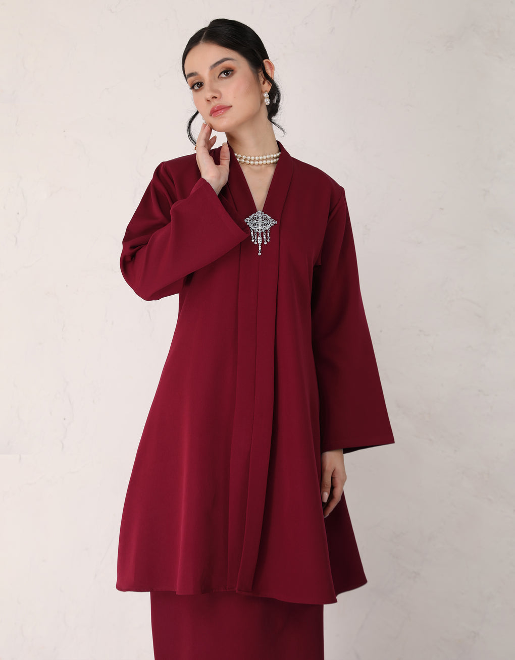 "Baju Kebarung Hawa" blends timeless tradition with modern grace. Crafted from premium premium Italian crepe - Its flowing, long silhouette offers cultural authenticity and all-day comfort-perfectly for formal events or refined daily wear. This piece honors heritage while embracing today’s fashion sensibilities.