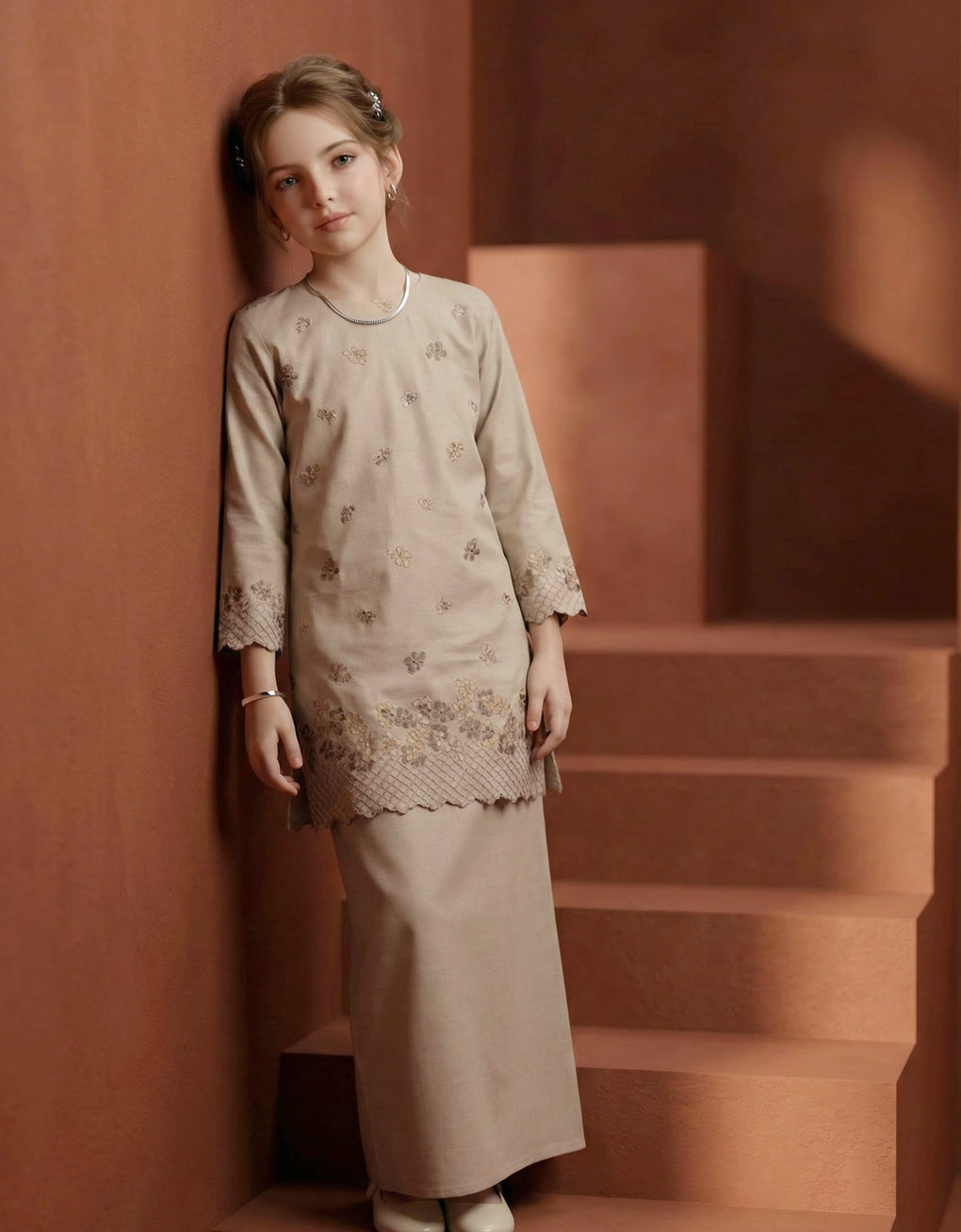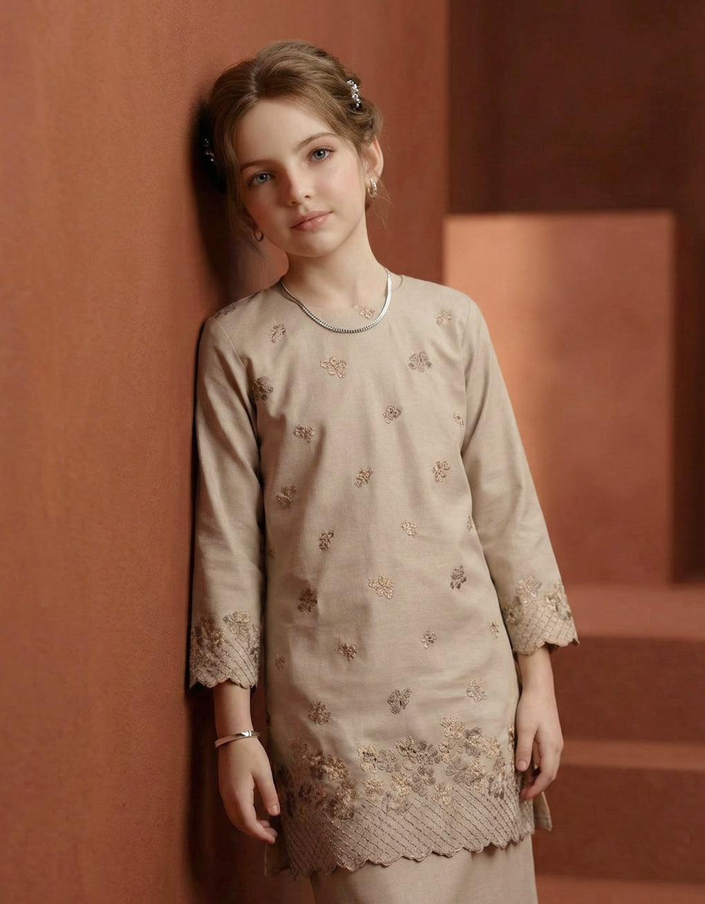 "Kids Baju Kurung Pahang Moden Lettie" blends tradition with a modern touch. Made from premium linen cotton with beautiful multicolor embroidery, it offers comfort and elegance in a long, graceful cut. Perfect for formal events or stylish everyday wear, it’s a timeless piece for those who appreciate both heritage and contemporary style.