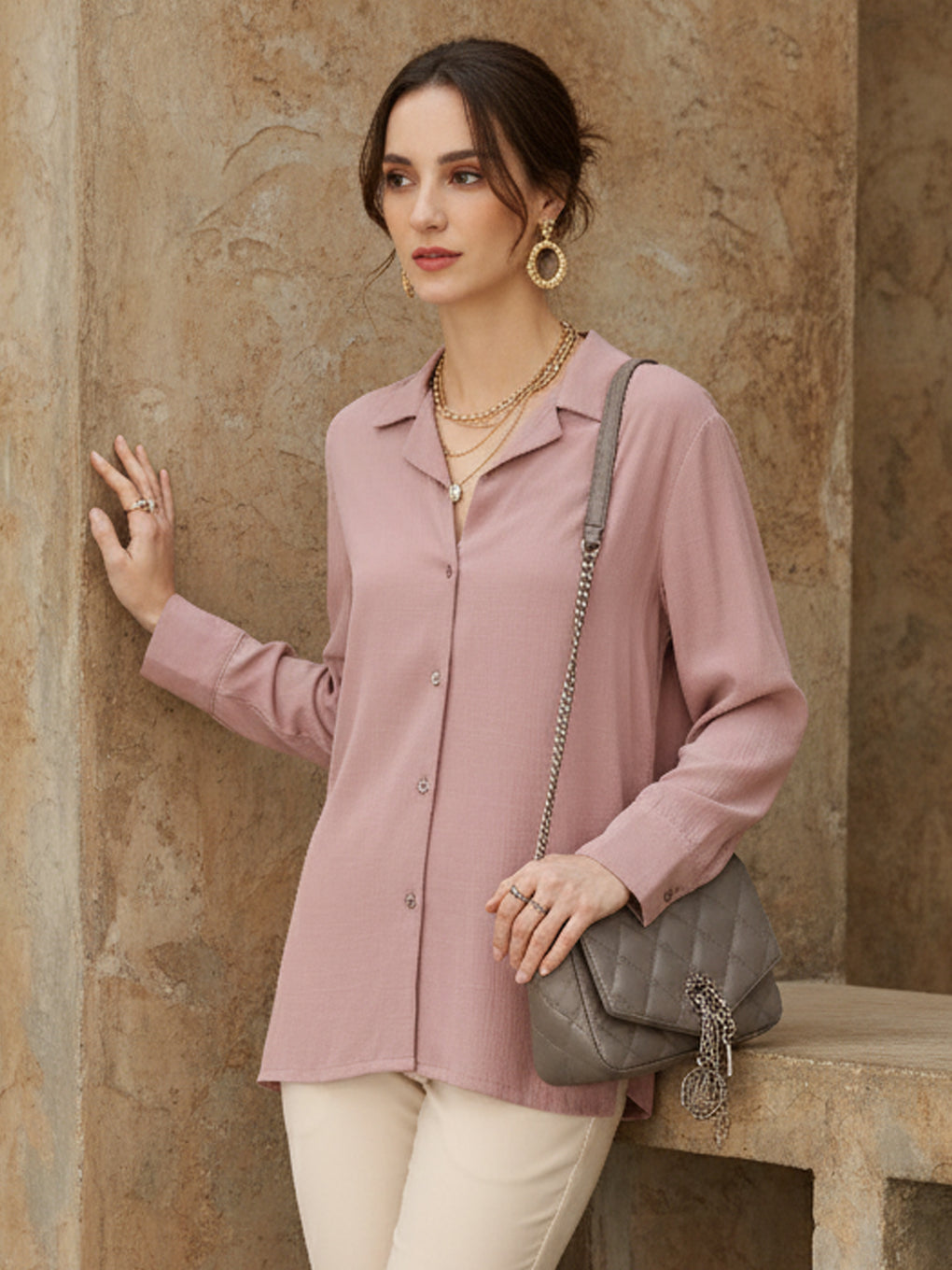 Zandra Top; long-sleeve relax fit shirt in our cotton rayon fabric, with notched collar and button-up. The lightweight and breathable fabric makes it ideal for warmer days, ensuring long-lasting wear.
