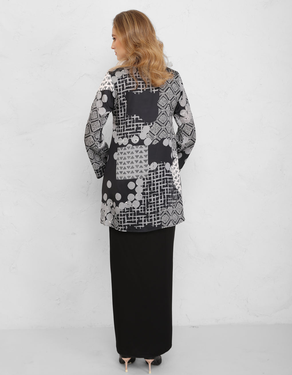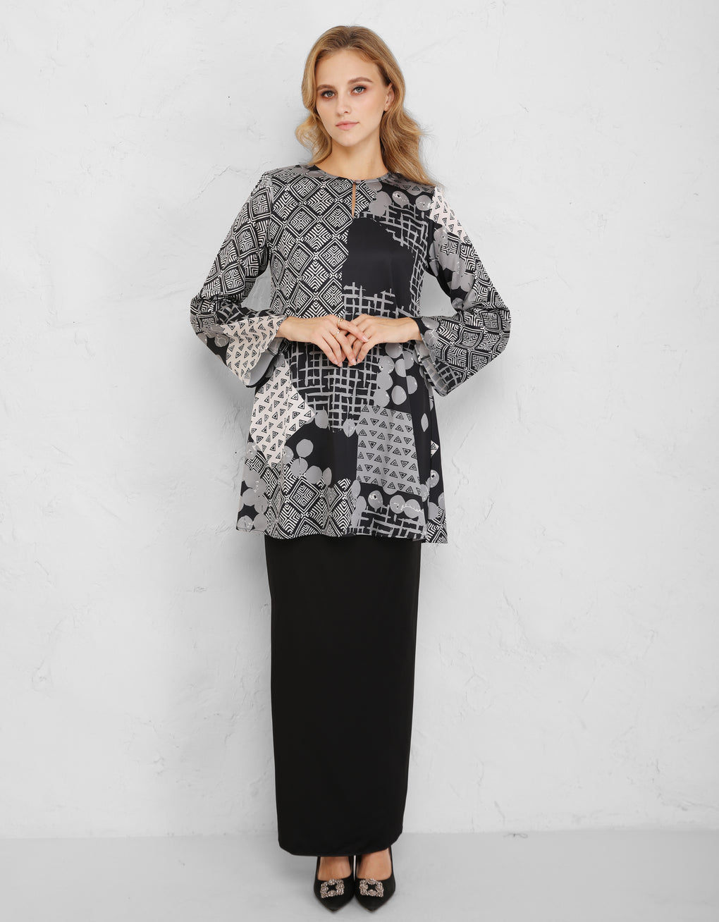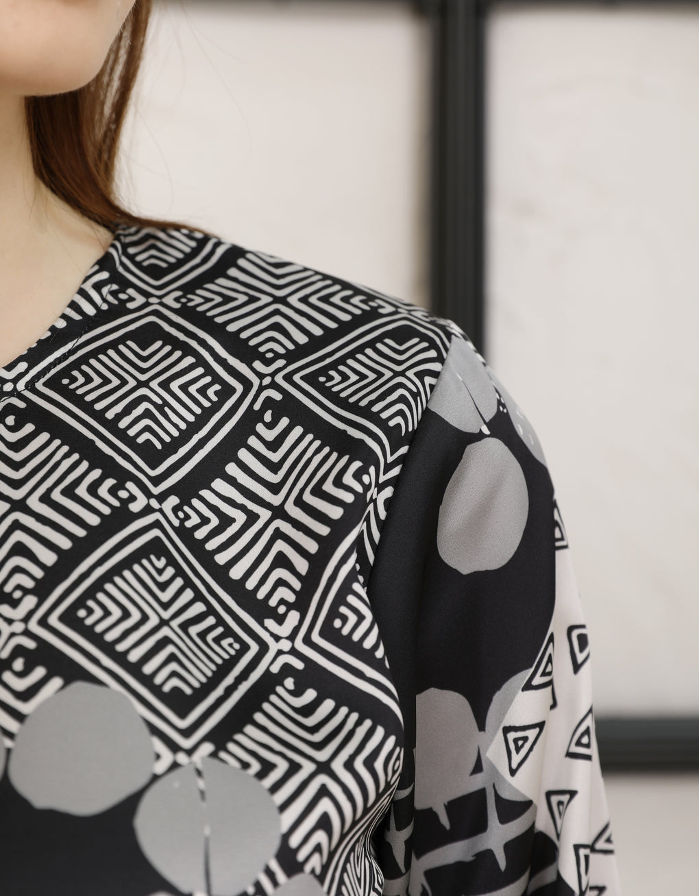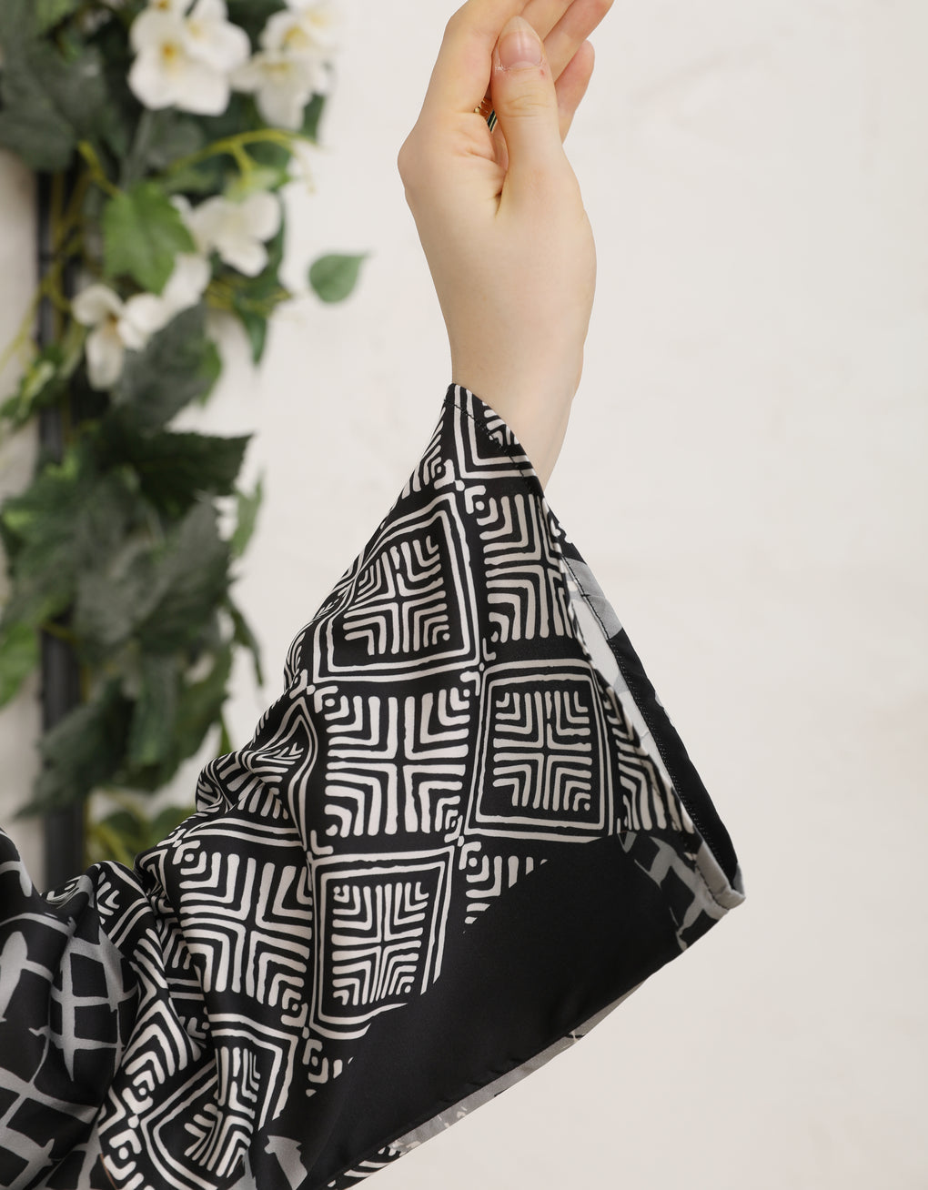 Material: Armani Silky Satin - Smooth texture, with a glossy front and elegant draping, featuring unique batik patterns.