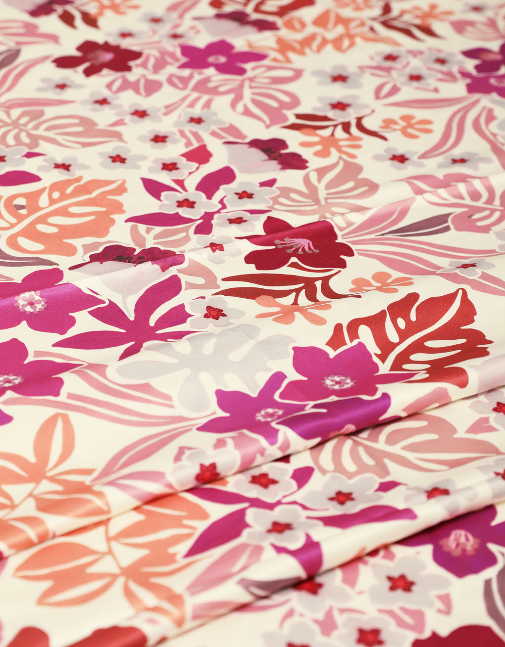 Beletino satin is a fabric that comes in exclusive floral and abstract  patterns. It is very comfy, breathable, and not transparent. This satin has a good of durability and drapability. It has a flowy drape that works well especially for garment sewing.