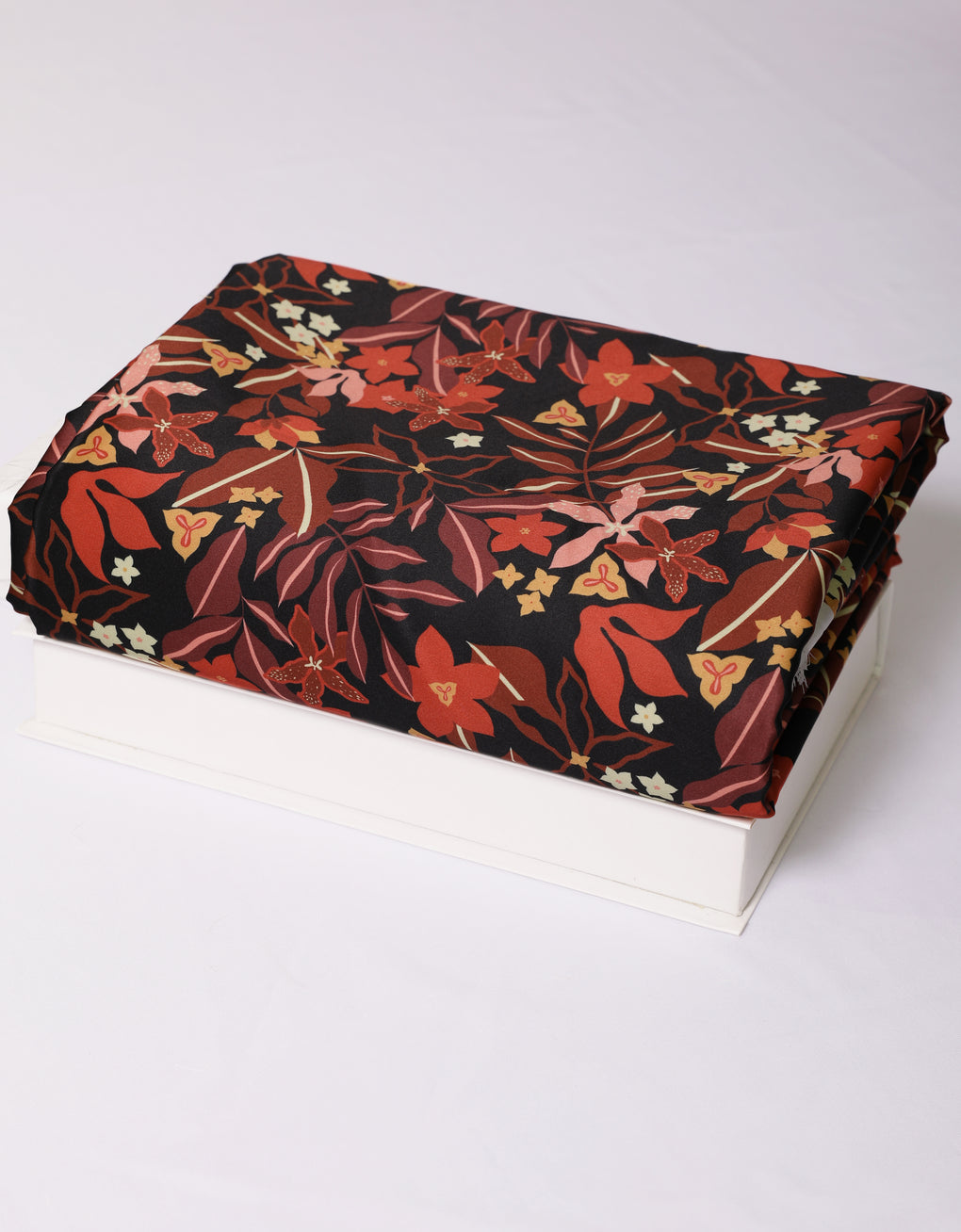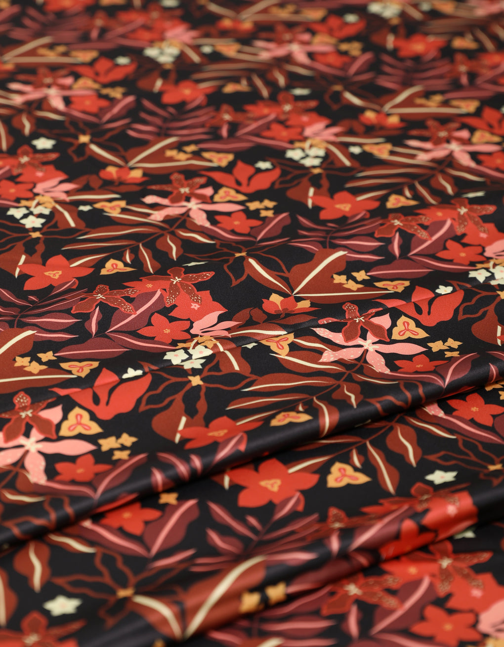 Beletino satin is a fabric that comes in exclusive floral and abstract  patterns. It is very comfy, breathable, and not transparent. This satin has a good of durability and drapability. It has a flowy drape that works well especially for garment sewing.