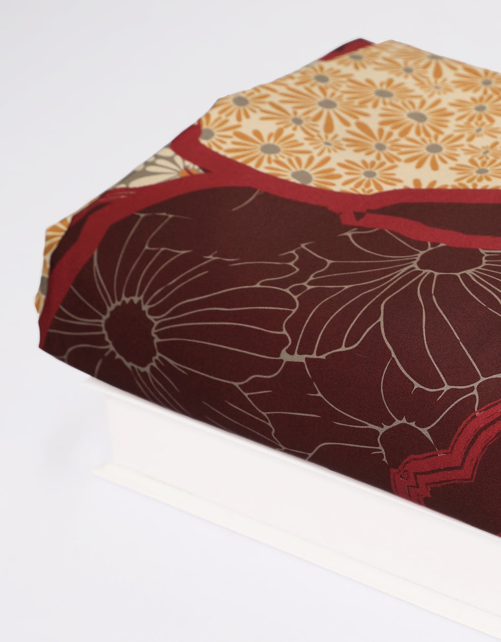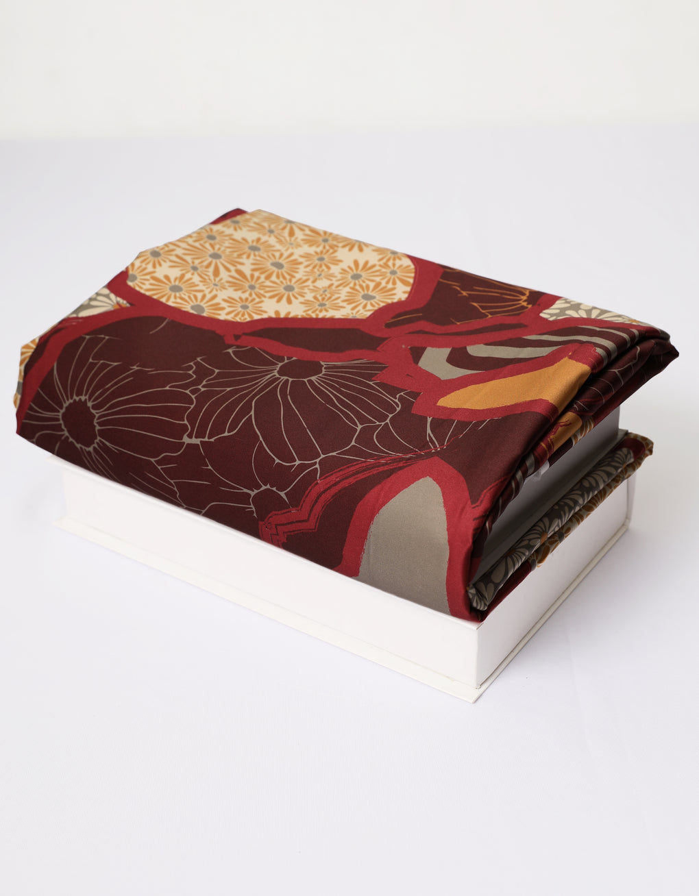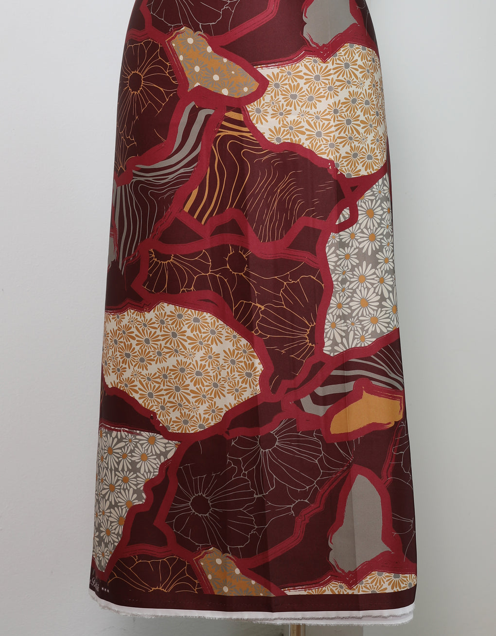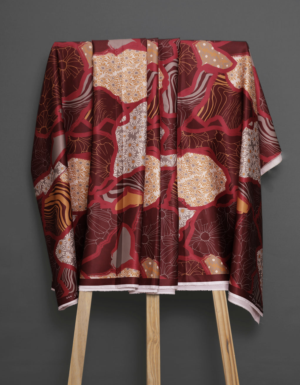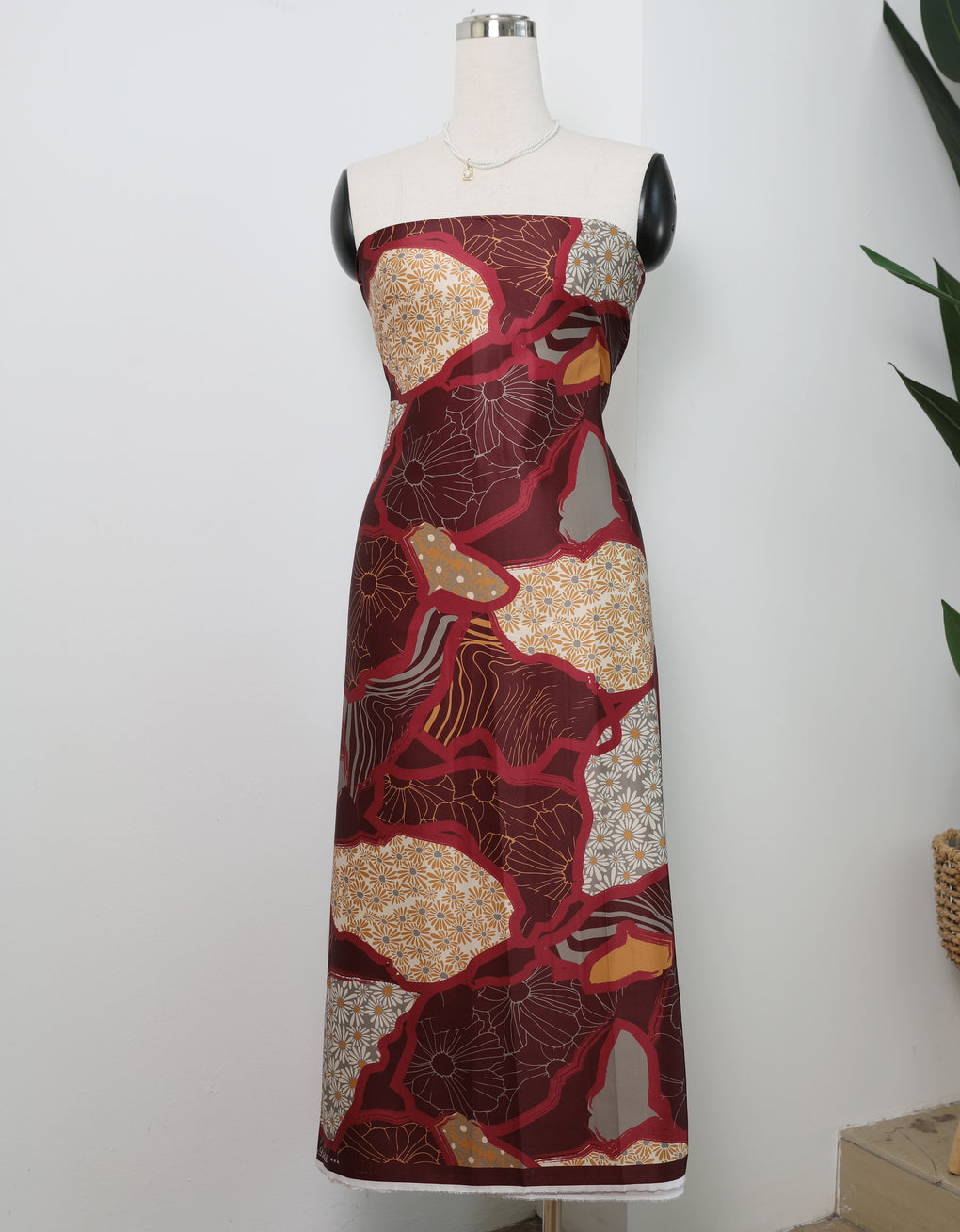 Jasmine Satin is a fabric that come in exclusive floral patterns and abstract. It is very comfy, breathable, and not transparent. This satin has a good of durability and drapability. It has a flowy drape that works well especially for garment sewing.