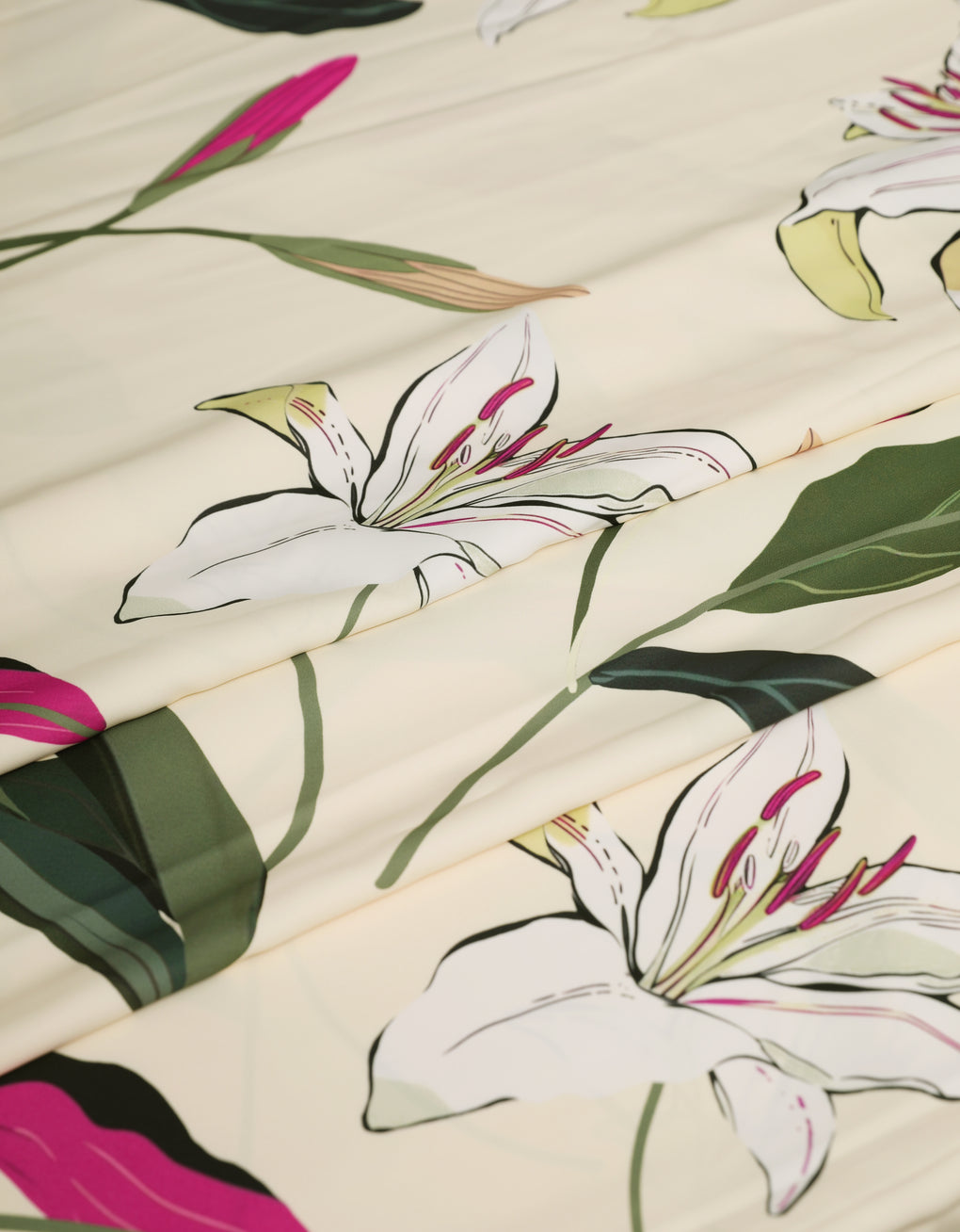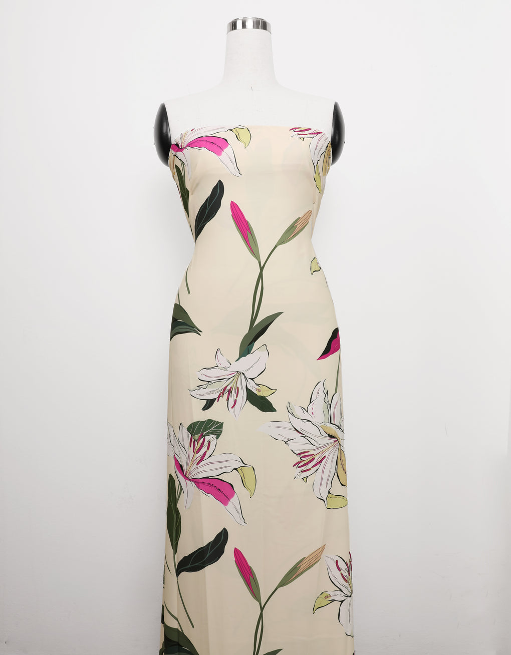 This printed Milania Crepe is the best quality of Silky Crepe that you can find at Malaysia market. It’s  delicate with a luxurious look and has a very smooth texture. It fits perfectly on the figure, emphasizing the attractiveness of its shape.