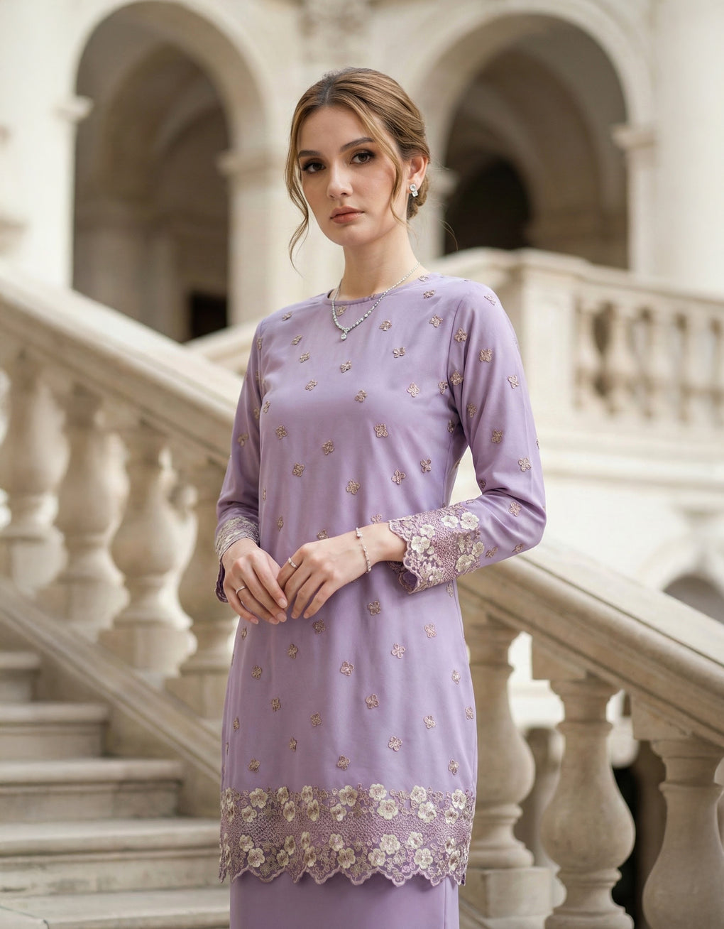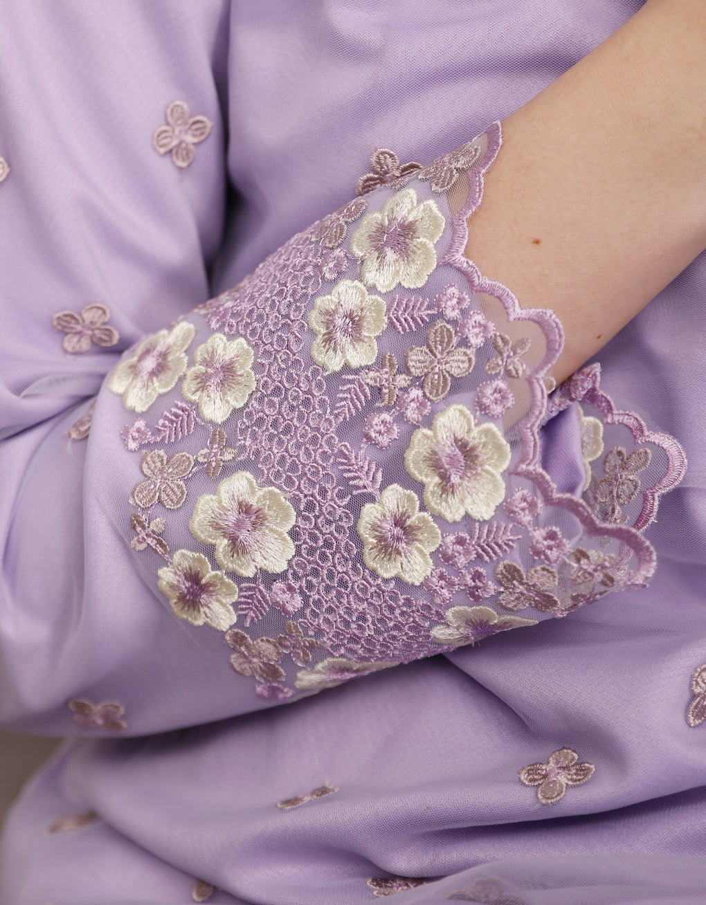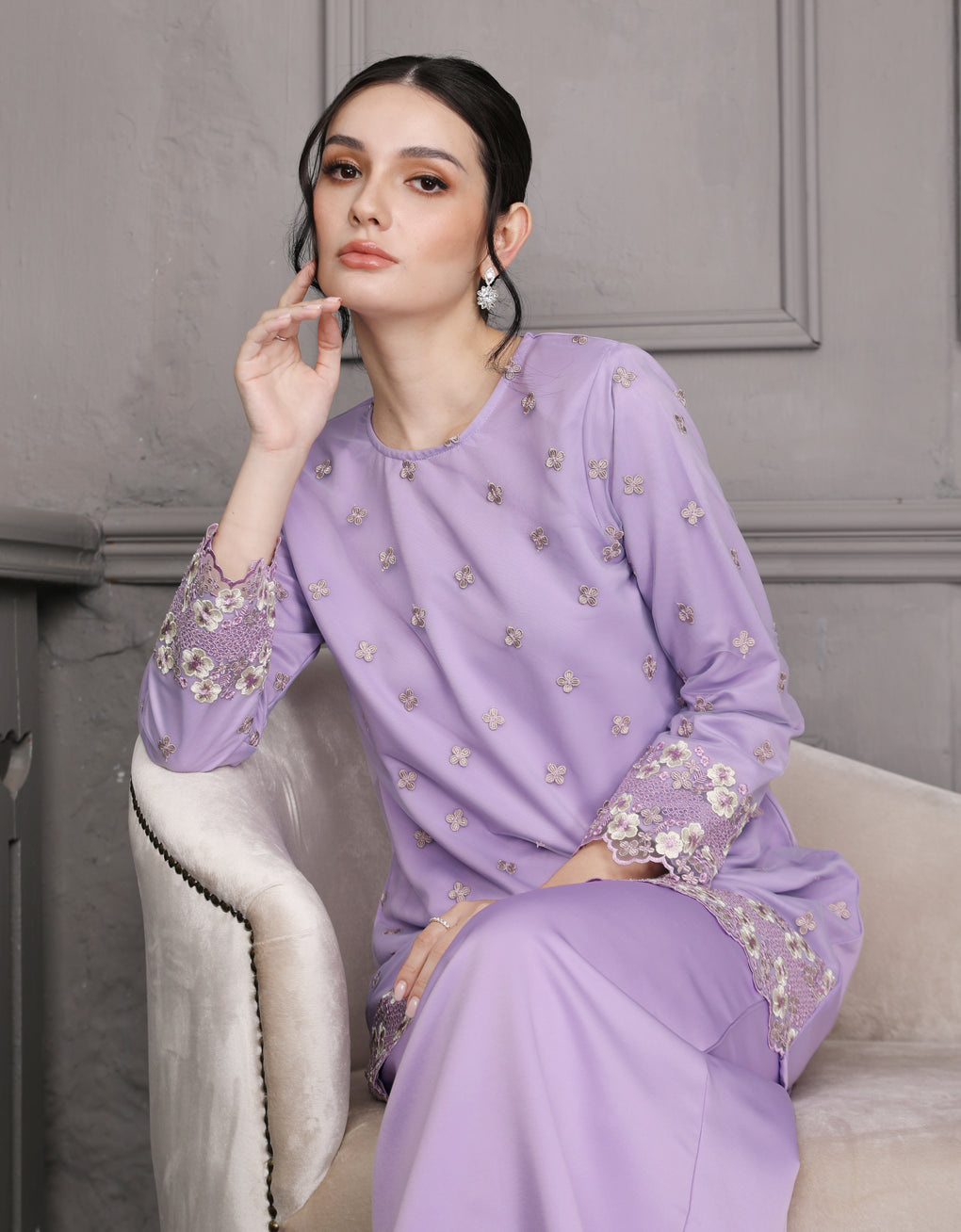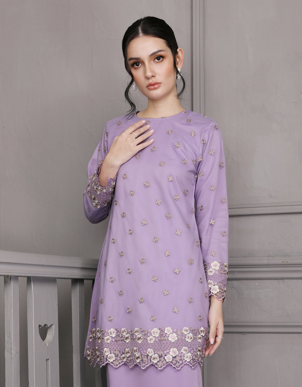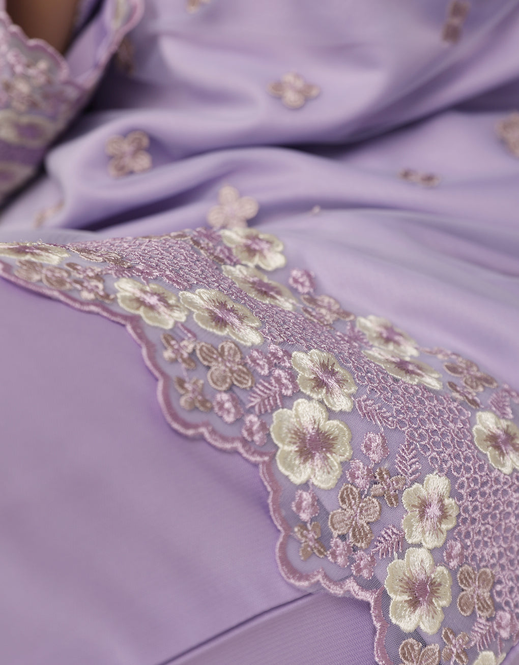 Crafted in a timeless Moden cut, this piece offers a comfortable fit. Delicate floral embroidered lace and a subtly geometric hem create a graceful blend of femininity and elegance perfect for any occasion.