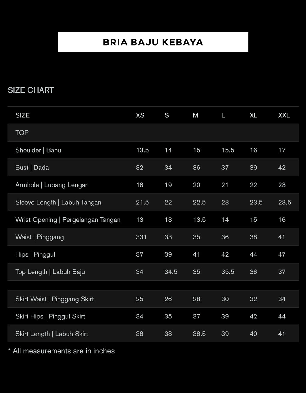 | Skirt Waist | Pinggang Skirt | 25 | 26 | 28 | 30 | 32 | 34 |